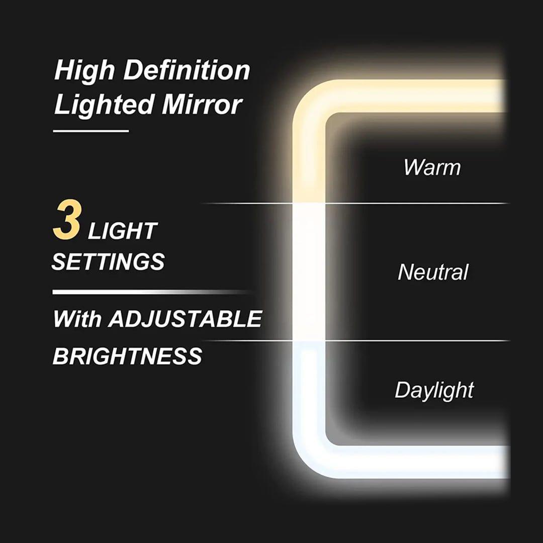 المرآة المضيئة فيها 3 وضعيات للإضاءة تبرز تفاصيل وجهك بوضوح، وتقدرين تغيرين درجة حرارة اللون وتتحكمين بقوة السطوع (من 0% إلى 100%) بس بلمسة وحدة.
