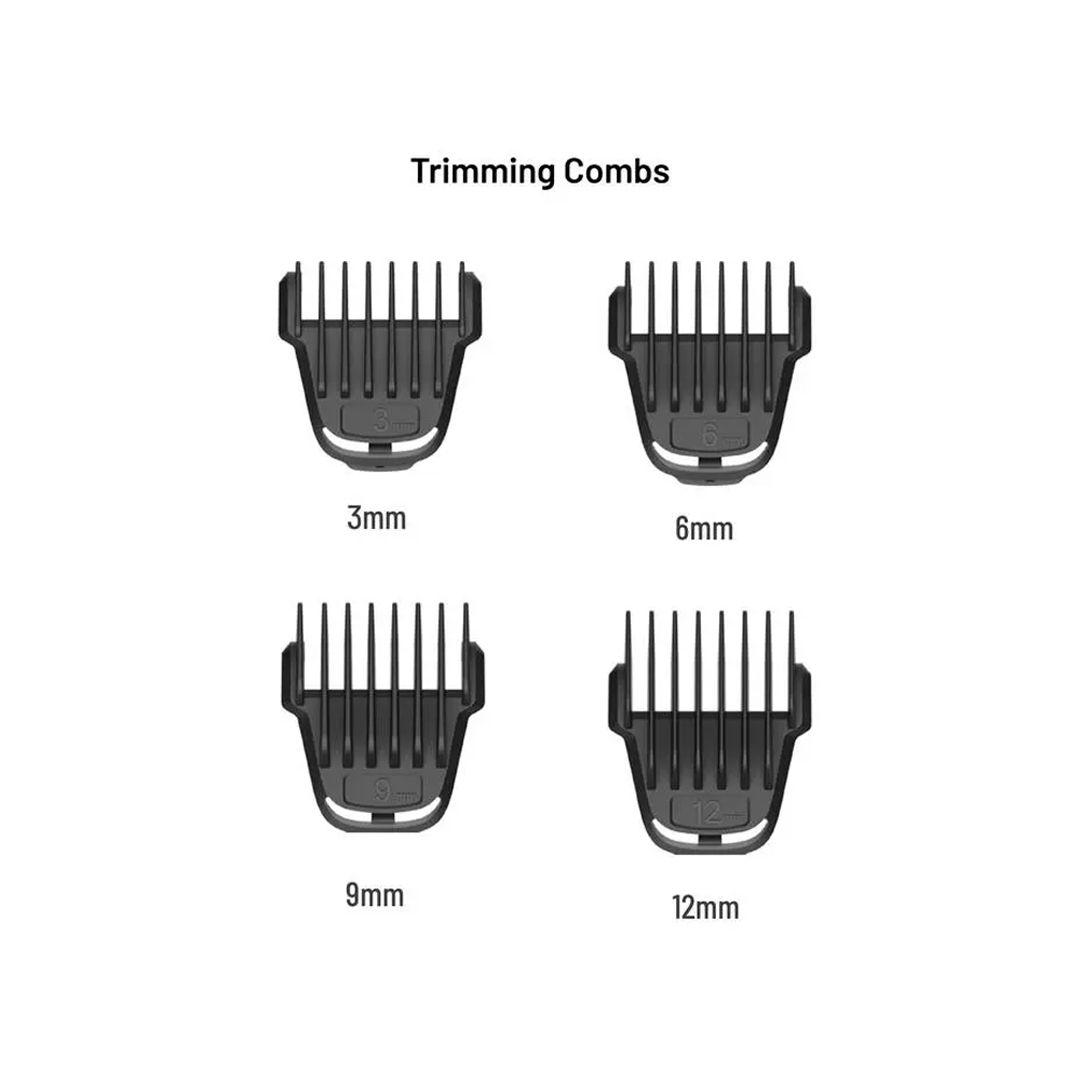 4 أمشاط قابلة للتعديل: يأتي مع 4 أمشاط بأطوال 3 مم، 6 مم، 9 مم، و12 مم لتحديد الطول المثالي لشكل لحيتك.