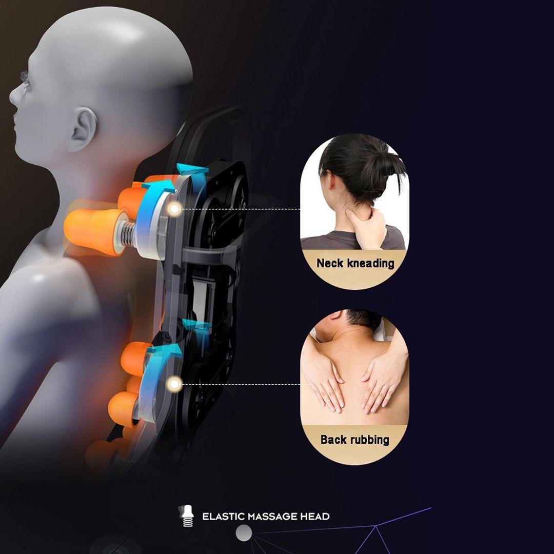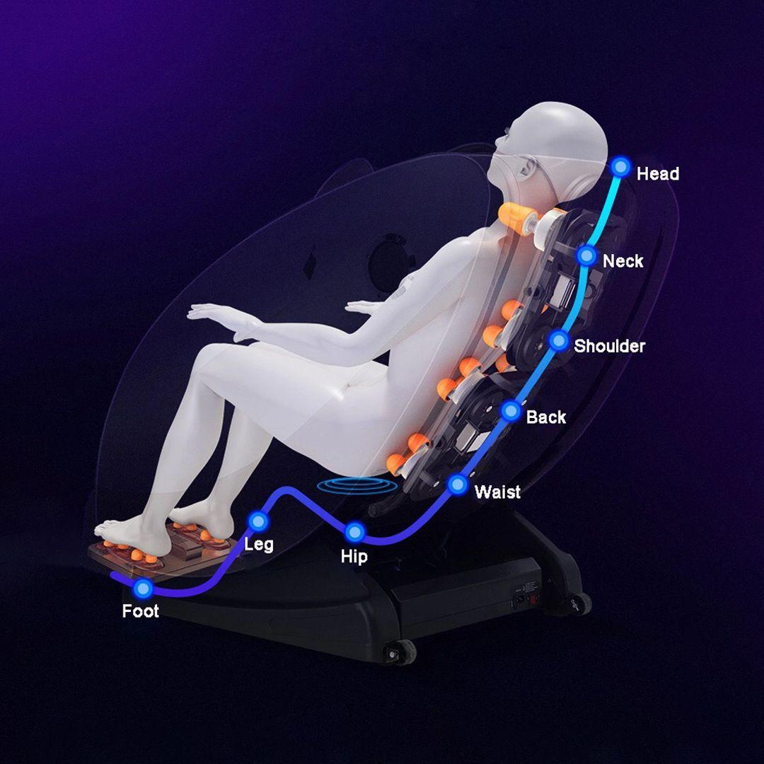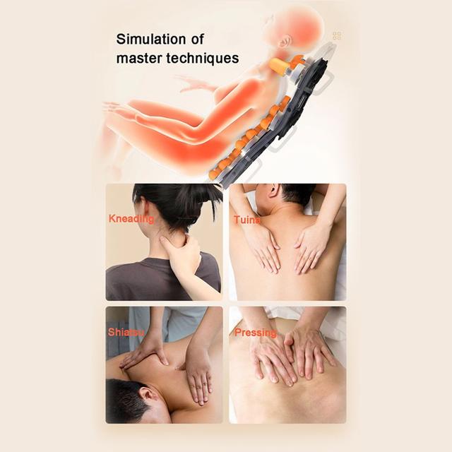 - تدليك شامل للجسم: كرات تدليك ثابتة وحركة للأمام والخلف من الرقبة إلى الفخذ، مع تدليك خاص للقدمين.