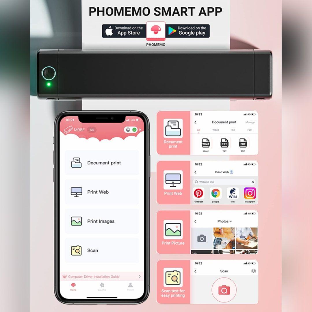 طابعة حرارية لاسلكية Phomemo M08F بدون حبر تعمل بالبلوتوث تدعم ورق حراري A4 مع تطبيق ذكي