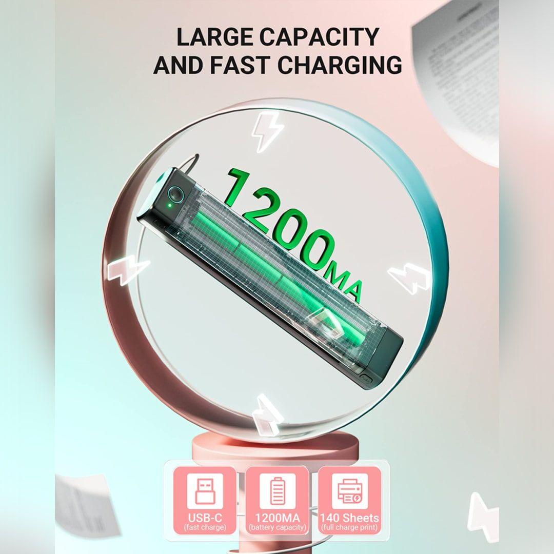 بطارية 1200mAh قابلة للشحن، تخلّيك تطبع 120 ورقة A4 متواصلة، وتكمل شغلك وانت مرتاح.
