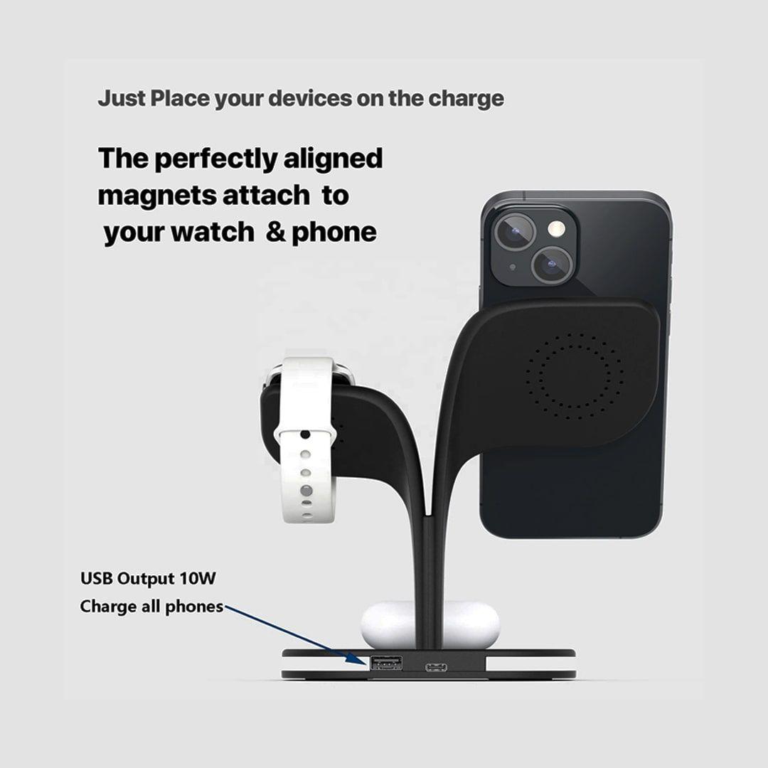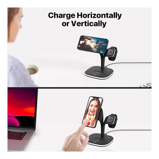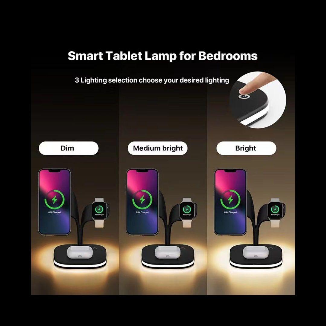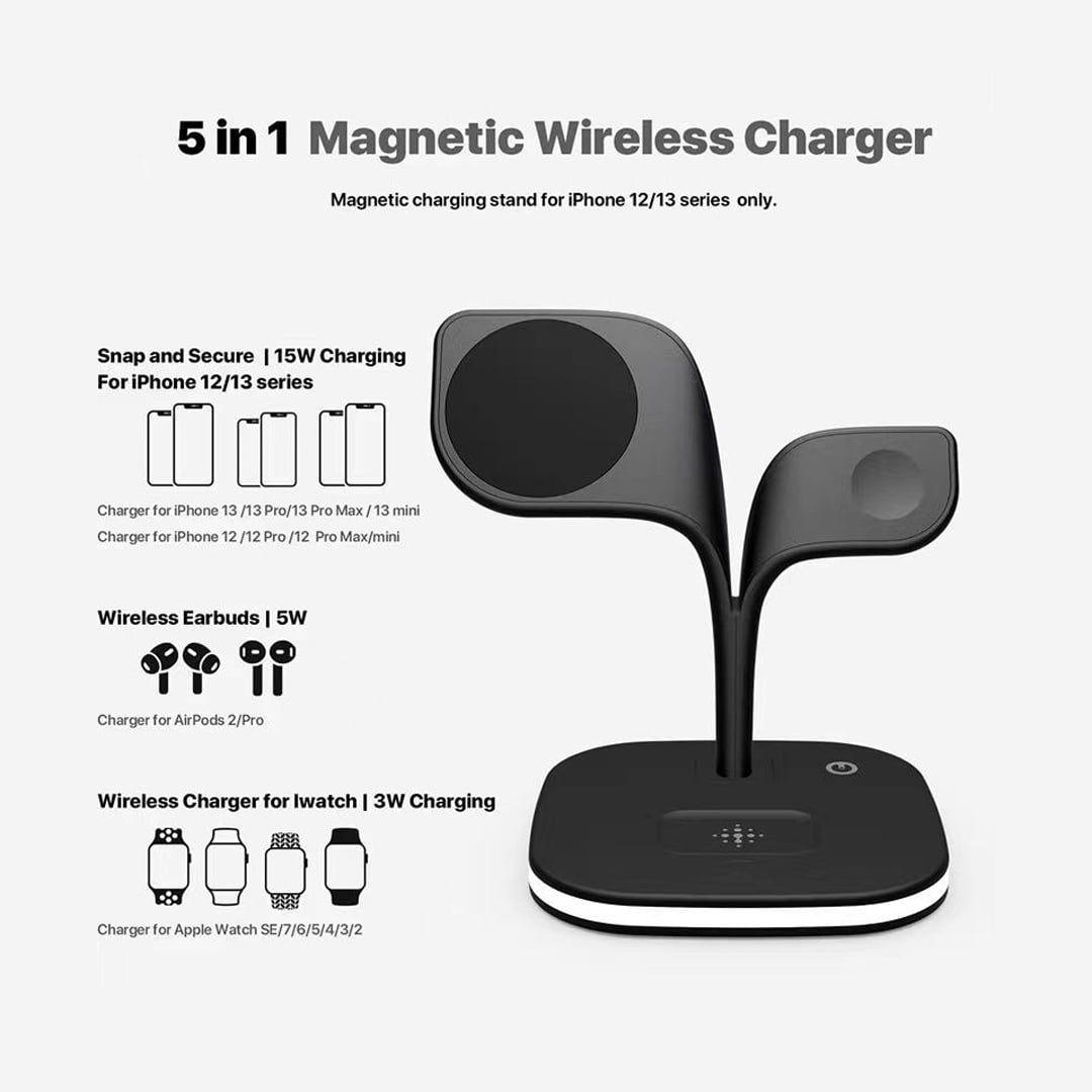 شاحن مغناطيسي لاسلكي 5×1 يدعم الشحن السريع للهواتف والساعات الذكية والايربودز مع مصباح اضاءة LED