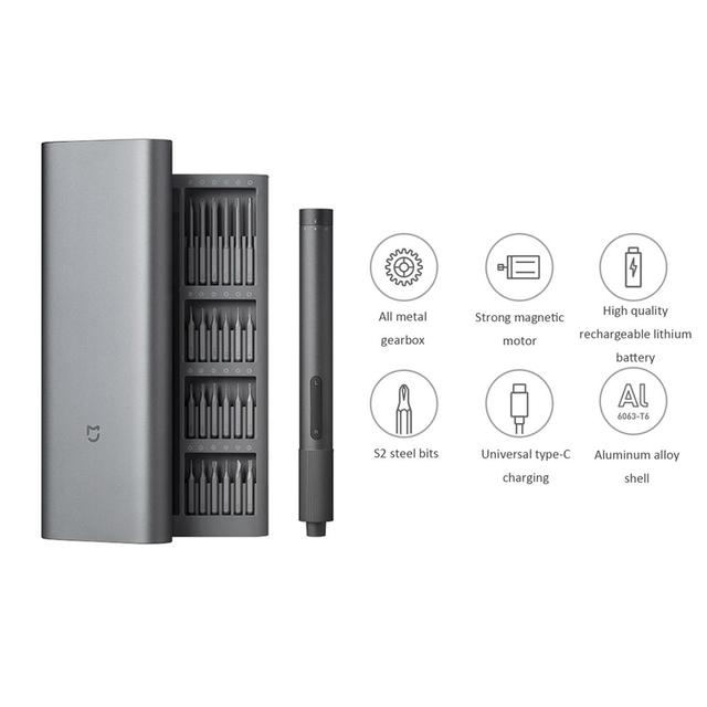طقم مفك براغي كهربائي من 28 قطعة من شاومي مع لقم مغناطيسية دقيقة وصندوق من الألومنيوم قابل لإعادة الشحن مع محرك مغناطيسي قوي