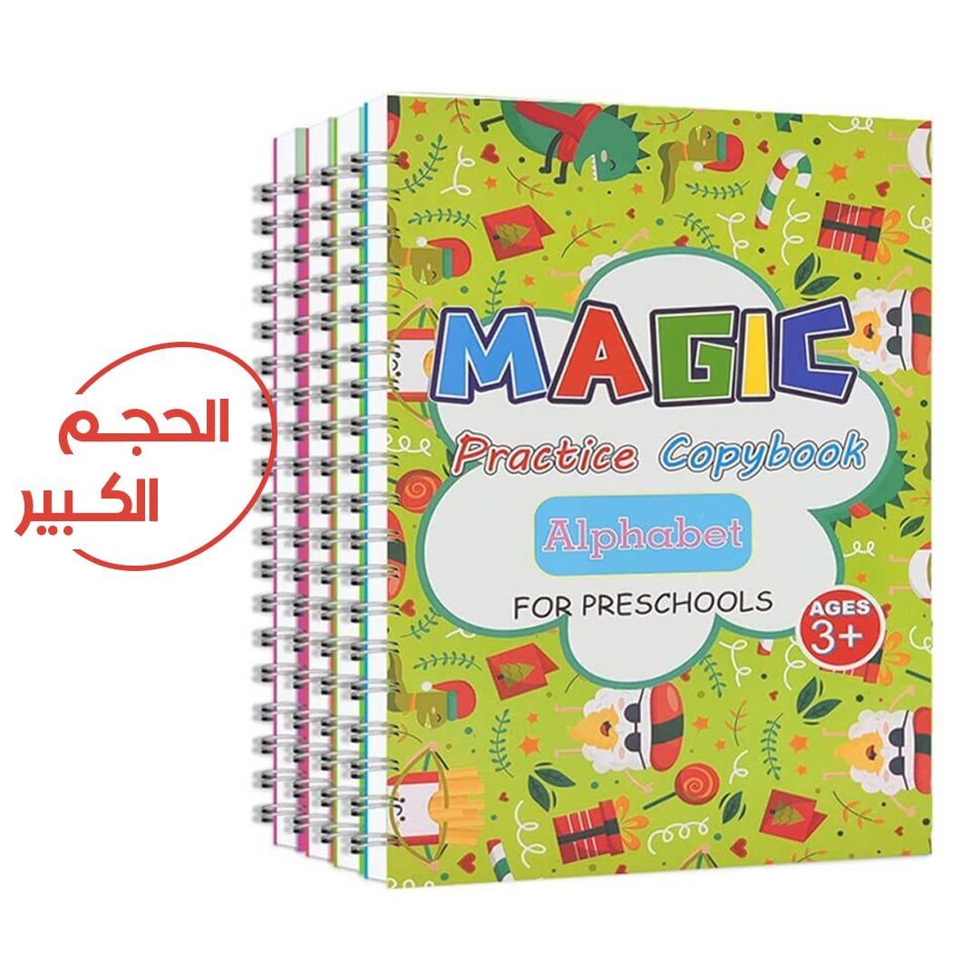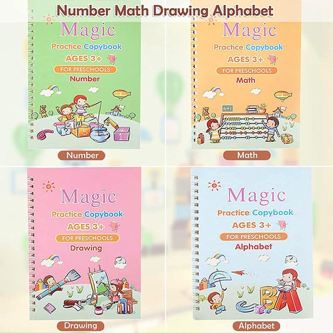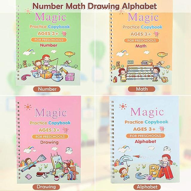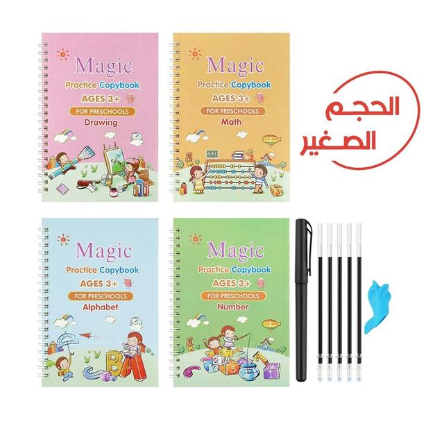 مجموعة الكتب السحرية للأطفال مكونة من 4 كتب، مجموعة التدريب السحرية على الكتابة والخطوط التي يمكن اعادة استخدامها