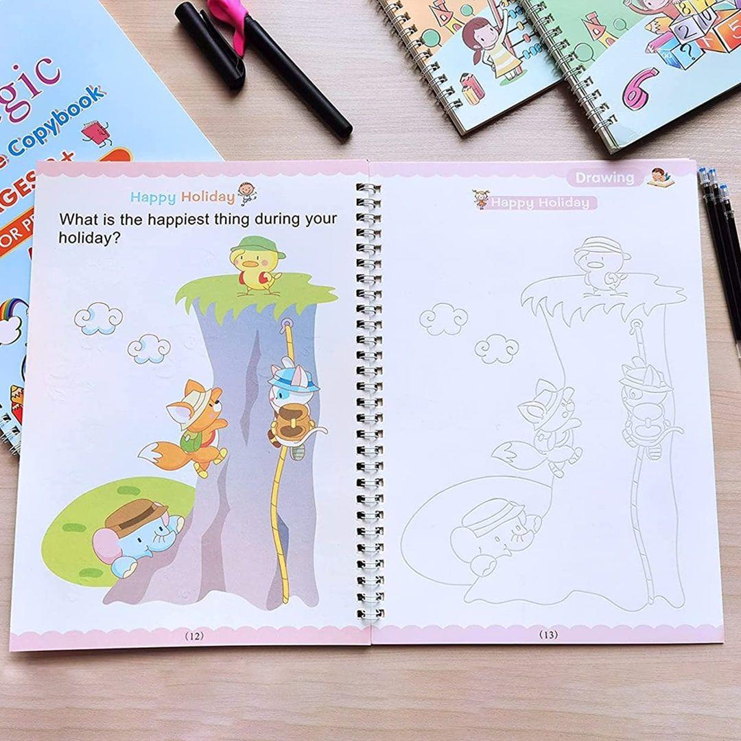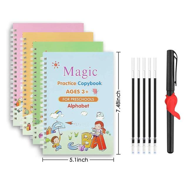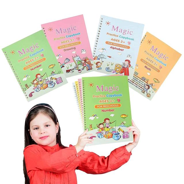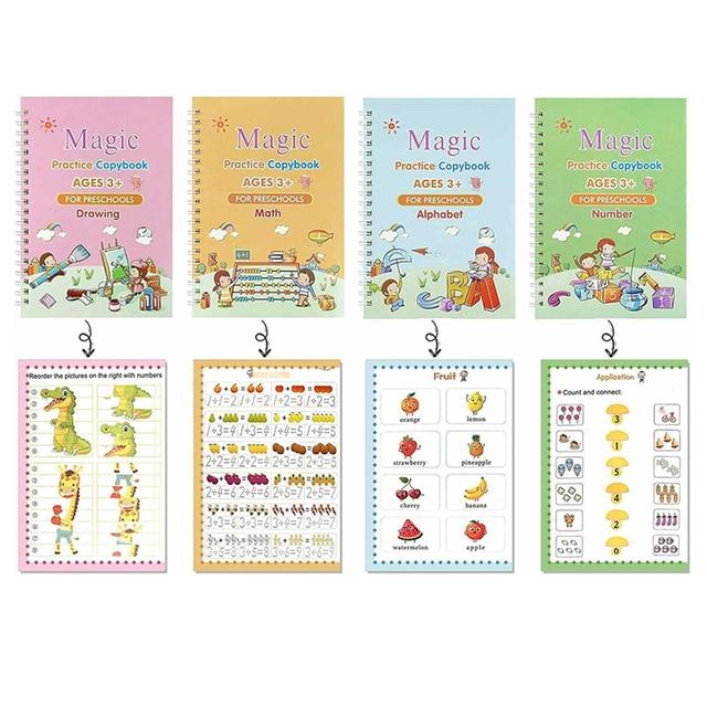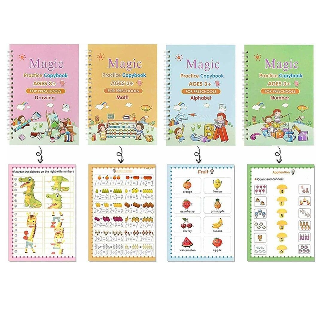 مجموعة الكتب السحرية للأطفال مكونة من 4 كتب، مجموعة التدريب السحرية على الكتابة والخطوط التي يمكن اعادة استخدامها