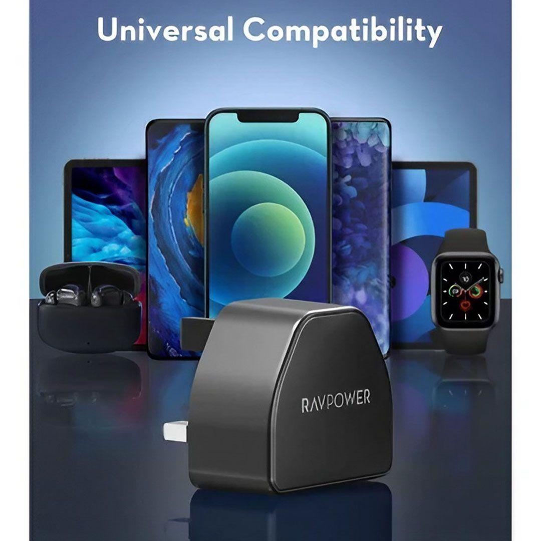 احصل على تجربة شحن قوية وسريعة مع شاحن RAVPower بقوة 20 واط، المصمم بحجم صغير ومدمج ليوفر لك أداءً مثاليًا في أي وقت وأي مكان، بفضل تقنية PPS وPD 3.0، ستتمكن من شحن أجهزتك الذكية بسرعة وكفاءة، مع حماية متقدمة ضد الجهد الزائد لضمان سلامة أجهزتك.