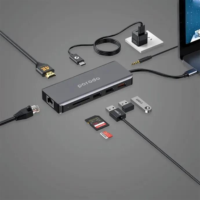 موزع USB-C من بورودو 9 في 1 متعدد المنافذ 100 واط ( ،Type-C، PD، HDMI Ethernet، USB، SD Card، مم 3.5 AUX )