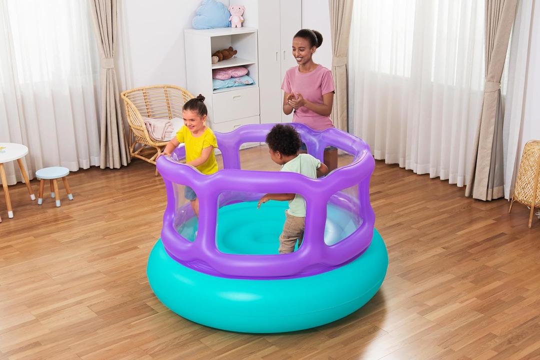 اللعبة مصممة على شكل مسبح دائري مع جدران منفوخة، تخلي عيالك ينطّون ويضحكون بأمان، وتمنحهم مساحة يلعبون فيها براحتهم بدون لا تحاتي.