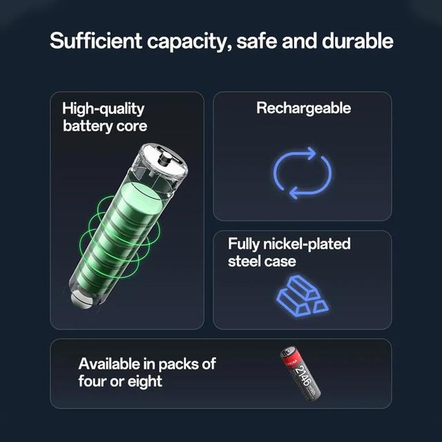 قابلة لإعادة الشحن حتى 1200 مرة، مما يقلل من الحاجة إلى استبدال البطاريات بشكل متكرر، ويُسهم في تقليل النفايات الإلكترونية.
