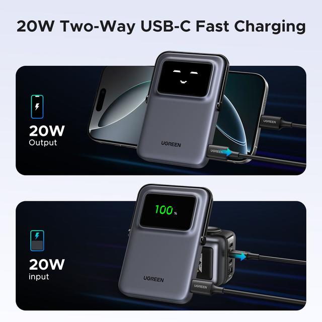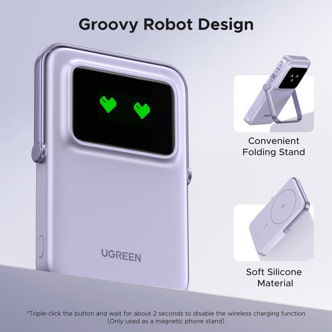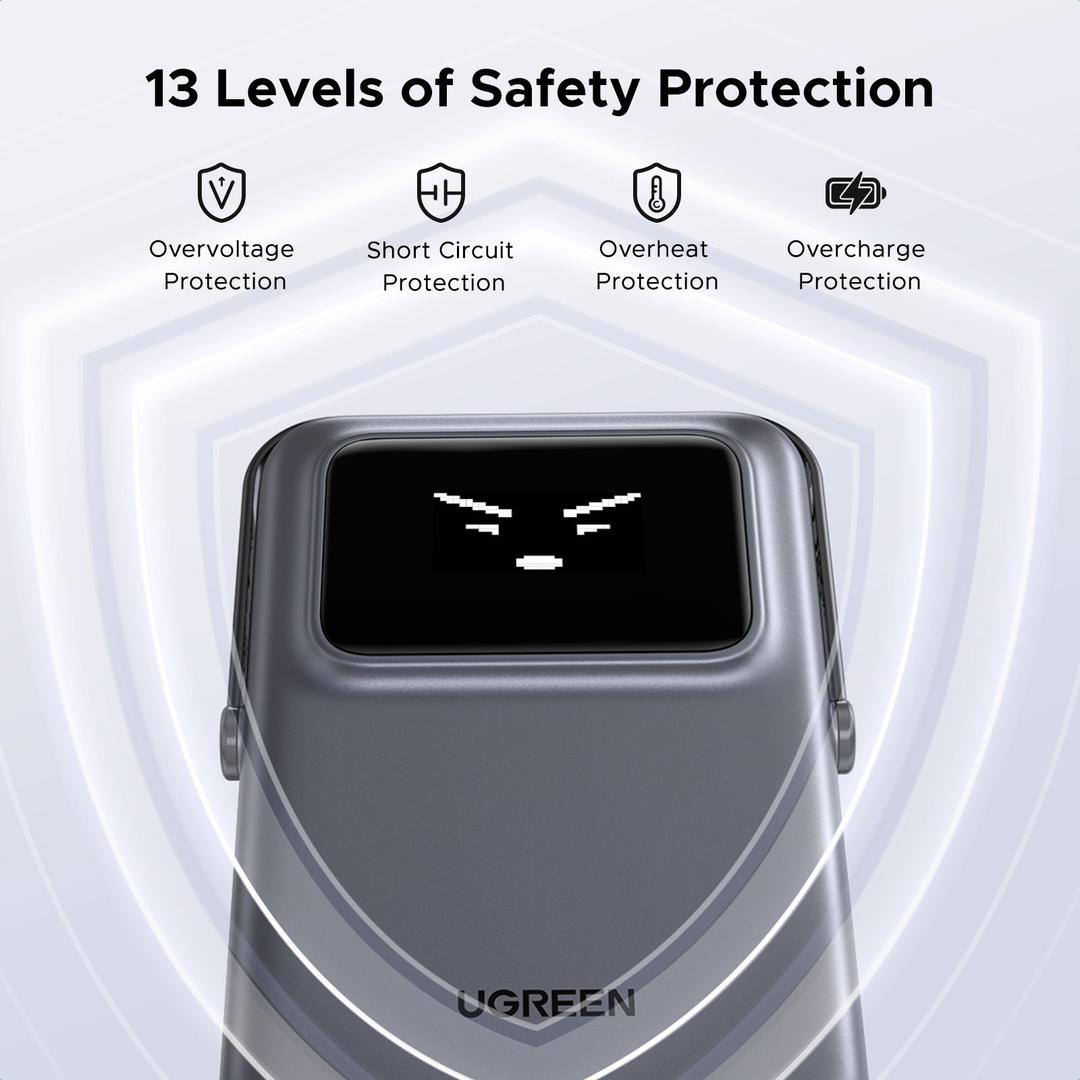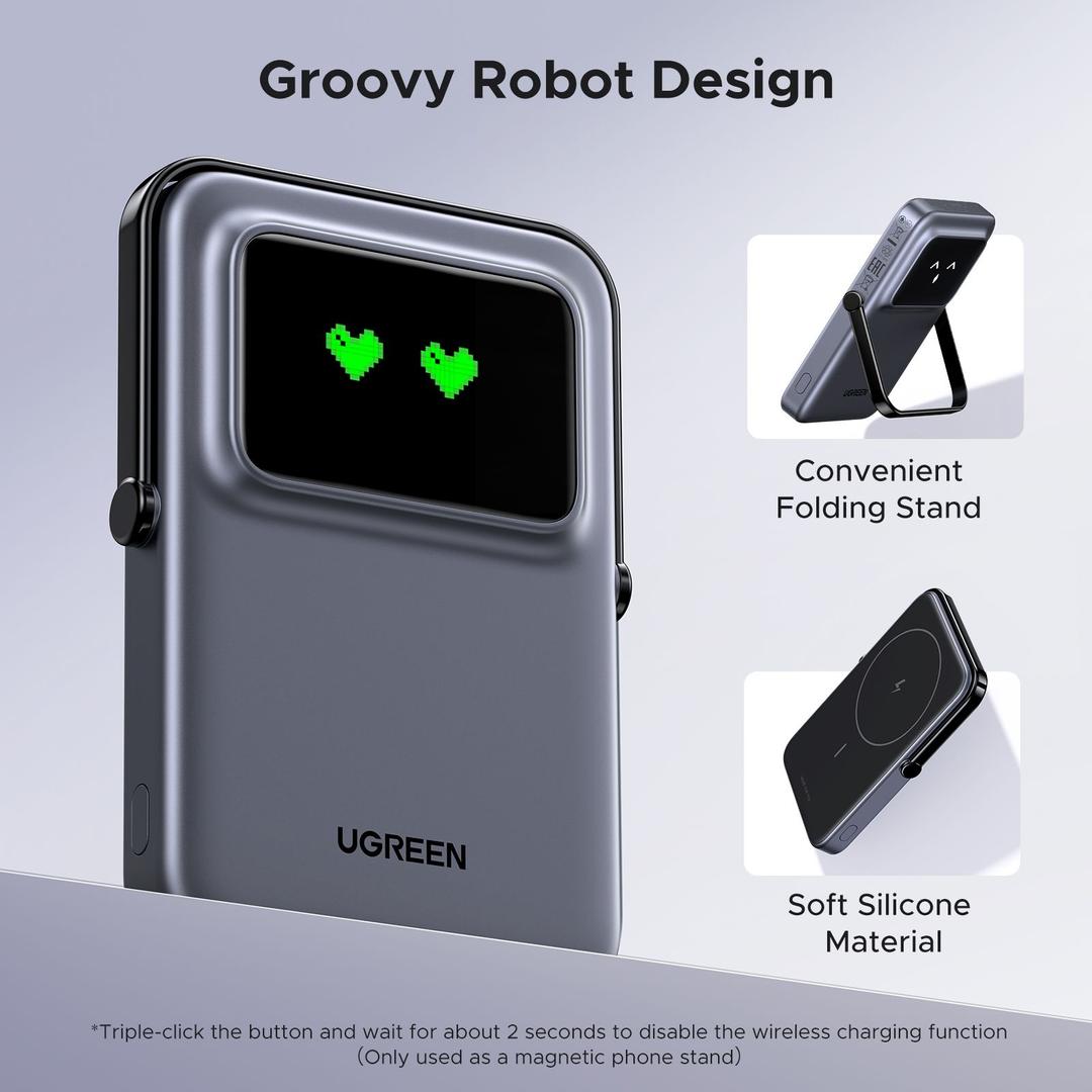 باور بانك UGREEN المغناطيسي يتميز بشاشة TFT واضحة تُظهر تعابير مختلفة حسب مستوى البطارية المتبقي، حتى تقدر تعرف حالة البطارية بنظرة سريعة، مع لمسة مرحة وشخصية مميزة في التصميم.