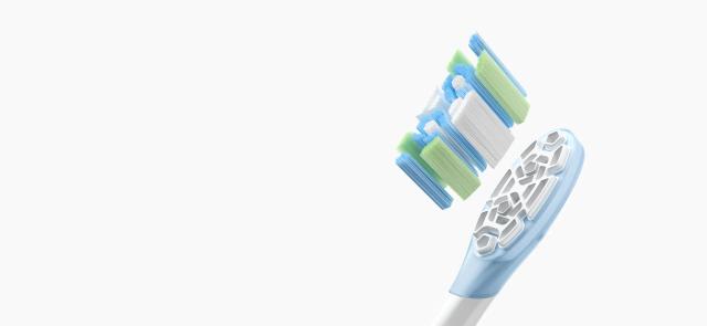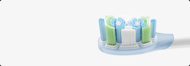 توصّل حتى الفراغات الصغيرة بين الأسنان بتنظيف قوي → تصميم برؤوس مزدوجة دوّارة “سبيرال” ينظّف سطح الأسنان بعمق.