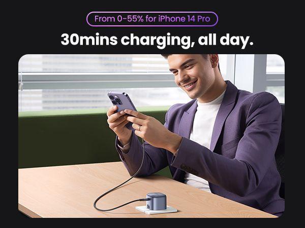 شاحن USB-C بقوة 30 واط: مع أقصى طاقة 30 واط، يشحن هذا الشاحن القابل للطي USB-C بقوة 30 واط معظم الأجهزة بكفاءة أعلى؛ على سبيل المثال، يشحن سلسلة هواتف iPhone 17 أسرع بثلاث مرات من شاحن 5 وات الأصلي، ويمكن شحن جهاز iPad Pro مقاس 12.9 بوصة (2020) بالكامل في 139 دقيقة، وهو أسرع بكثير من المحول الأصلي (207 دقائق).