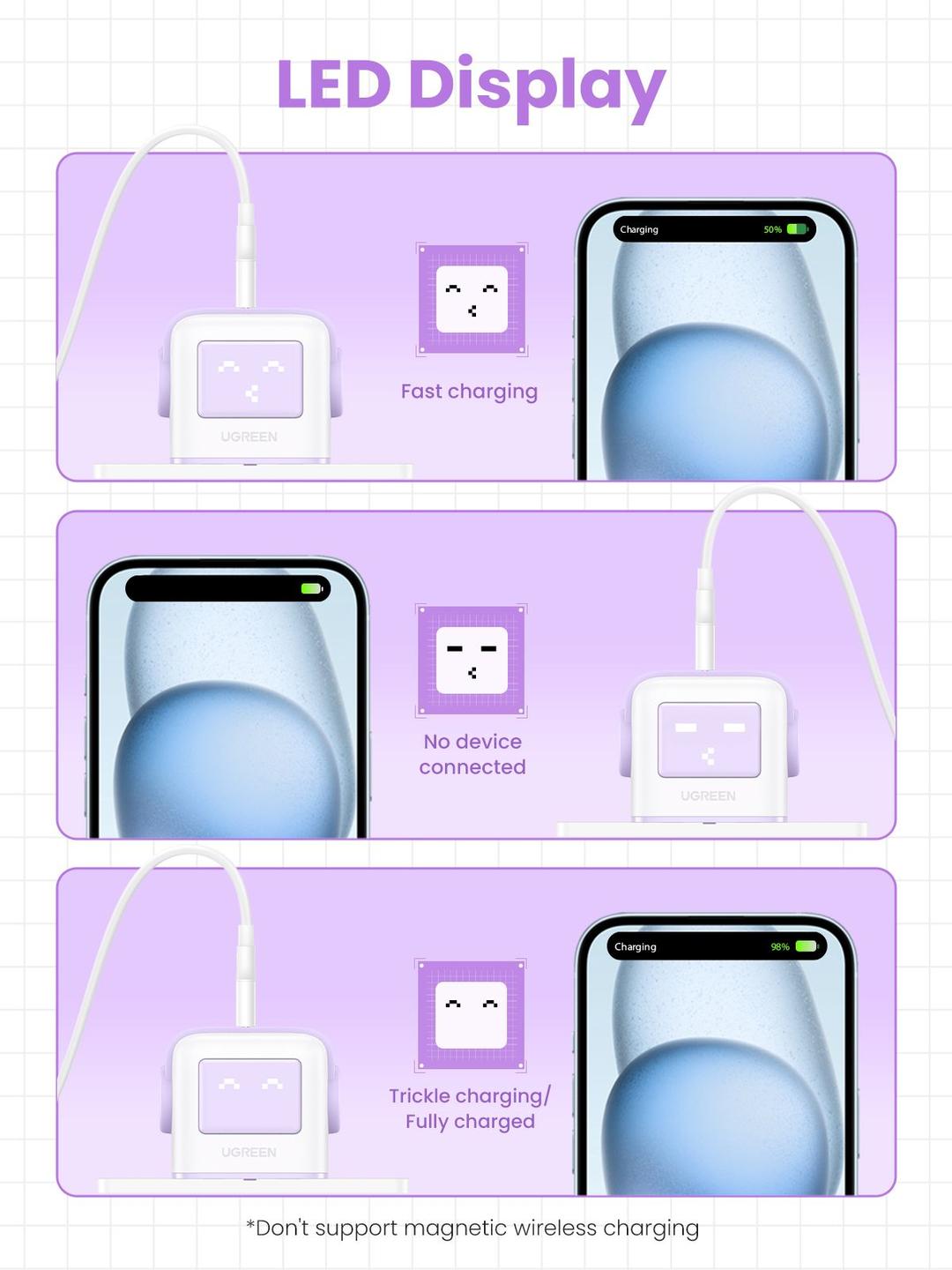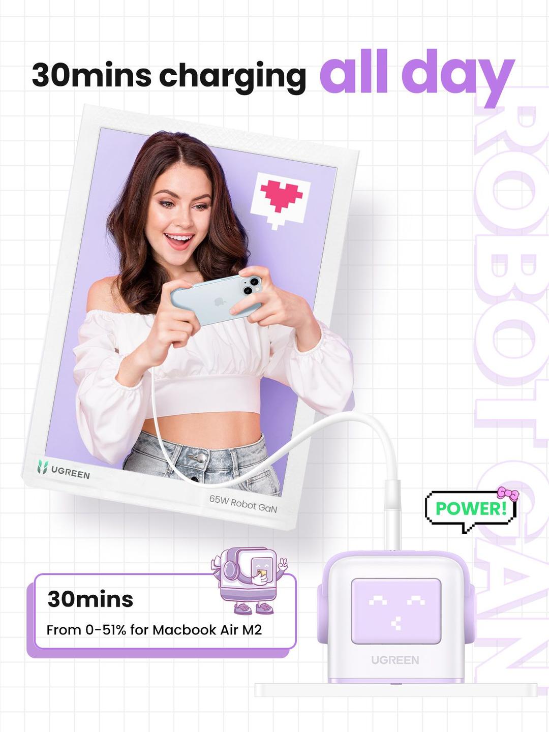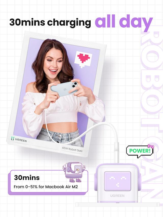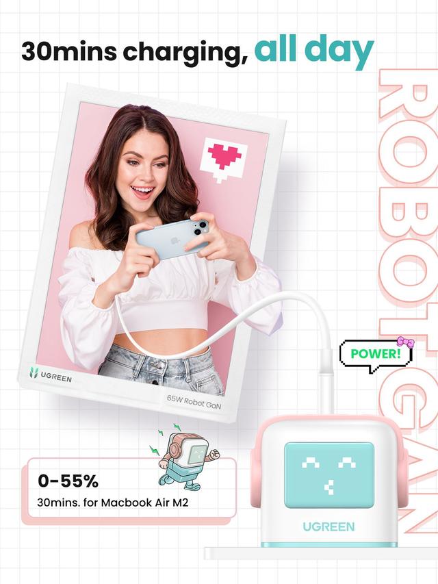 تصميم روبوتي، شحن أكثر متعة: شاحن يوجرين أونو 65 واط مزود بمنفذي USB-C ومنفذ USB-A، ما يتيح لك شحن هاتفك وجهازك اللوحي والأجهزة الأخرى، بالإضافة إلى جهاز الكمبيوتر المحمول المزود بمنفذ USB-C، بسرعة فائقة من منفذ واحد. تصميم الروبوت الفريد والجذاب يجعل عملية الشحن فريدة. شحن قوي وسريع بقوة 65 واط: يشحن هذا الشاحن جهاز MacBook Air M2 من 0 إلى 51% في 30 دقيقة فقط باستخدام منفذ USB-C واحد، وعند استخدام منفذ USB-C واحد أو منفذي USB-C وUSB-A معًا، سيوفر لك طاقة إجمالية قصوى تبلغ 65 واط. شاشة LED لعرض حالة الشحن: واجهة شاحن الحائط الروبوتي الصغير هي شاشة LED تعرض حالة الشحن فورًا عند بدء الشحن أو عند انتهائه. يرجى ملاحظة أن شاشة LED ستضيء فقط عند توصيله بمقبس الطاقة. توافق واسع: يتوافق شاحن الروبوت هذا مع أجهزة iPhone 15، 15 Plus، 15 Pro Max، 15 Pro، 14، 14 Pro Max، 13، MacBook Air M1، Watch 8، 7، HomePod، iPad Pro/Air/mini؛ AirPods Pro؛ Pixel 7، 6، Galaxy S24 Ultra، S23، A53، A52، Tab A8، A7، S8، وغيرها. نظام أمان متعدد: محول طاقة USB-C بقوة 65 واط مزود بحماية مدمجة من قصر الدائرة، والشحن الزائد، والسخونة الزائدة، والاندفاع، لضمان السلامة التامة. تصميم روبوتي، يجعل الشحن أكثر متعة