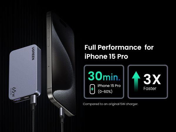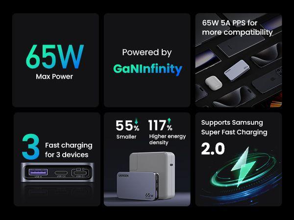 قوة ثلاثية: اشحن 3 أجهزة في وقت واحد عبر منفذي USB-C ومنفذ USB-A، مع توزيع طاقة إجمالية ذكية تبلغ 65 واط لشحن مثالي.