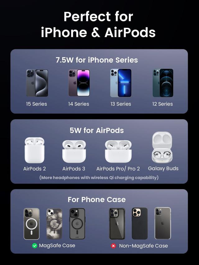 توافق واسع: تتوافق قاعدة الشحن الخاصة بنا مع العديد من الأجهزة، بما في ذلك سلسلة iPhone 15/15 Pro/15 Pro Max/14/13/12، وAirPods Pro 2/1، وAirPods3/2، وGalaxy Buds، وiWatch Ultra/8/7/SE/6/5/4/3/2، ومعظم الأجهزة التي تدعم Qi. لشحن مثالي، نوصي باستخدام جراب هاتف MagSafe أو هاتف عادي.