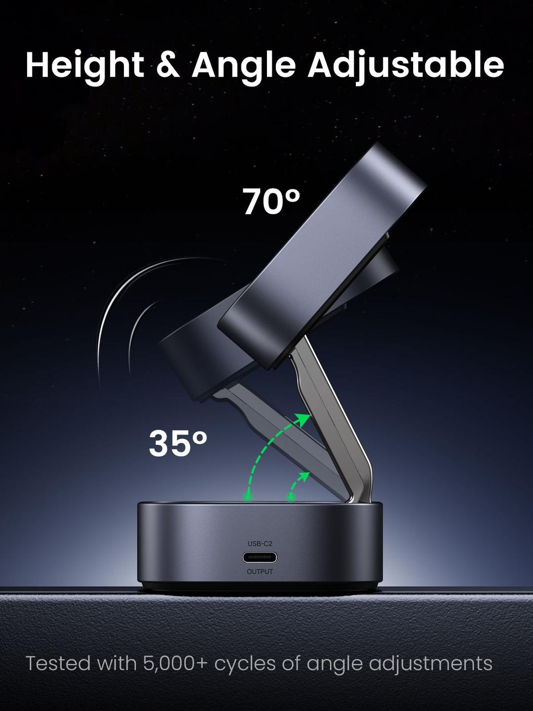 تصميم صغير الحجم قابل للطي: صُممت قاعدة الشحن اللاسلكية لتكون محمولة وقابلة للطي. يمكن طيها على شكل مربع صغير، مع إمكانية تعديل ارتفاعها وزاويتها. مقارنةً بالمنتجات المماثلة، فإن حجم شاحننا أصغر بنسبة 40%، مما يُسهّل حمله وتخزينه أثناء السفر.