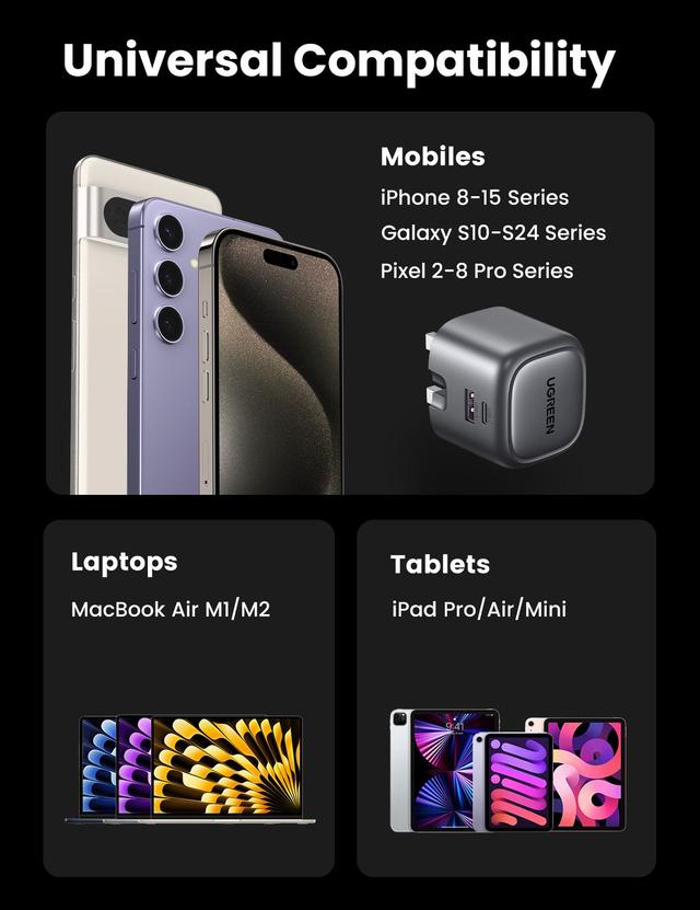 توافق عالي: يتميز هذا الشاحن بمنفذ USB-C بتوافق عالي، وهو متوافق مع هواتف iPhone 8-17 Series، وGalaxy S10-S25 Series، وSwitch، وAirPods، وWatch، والعديد من الأجهزة الأخرى.