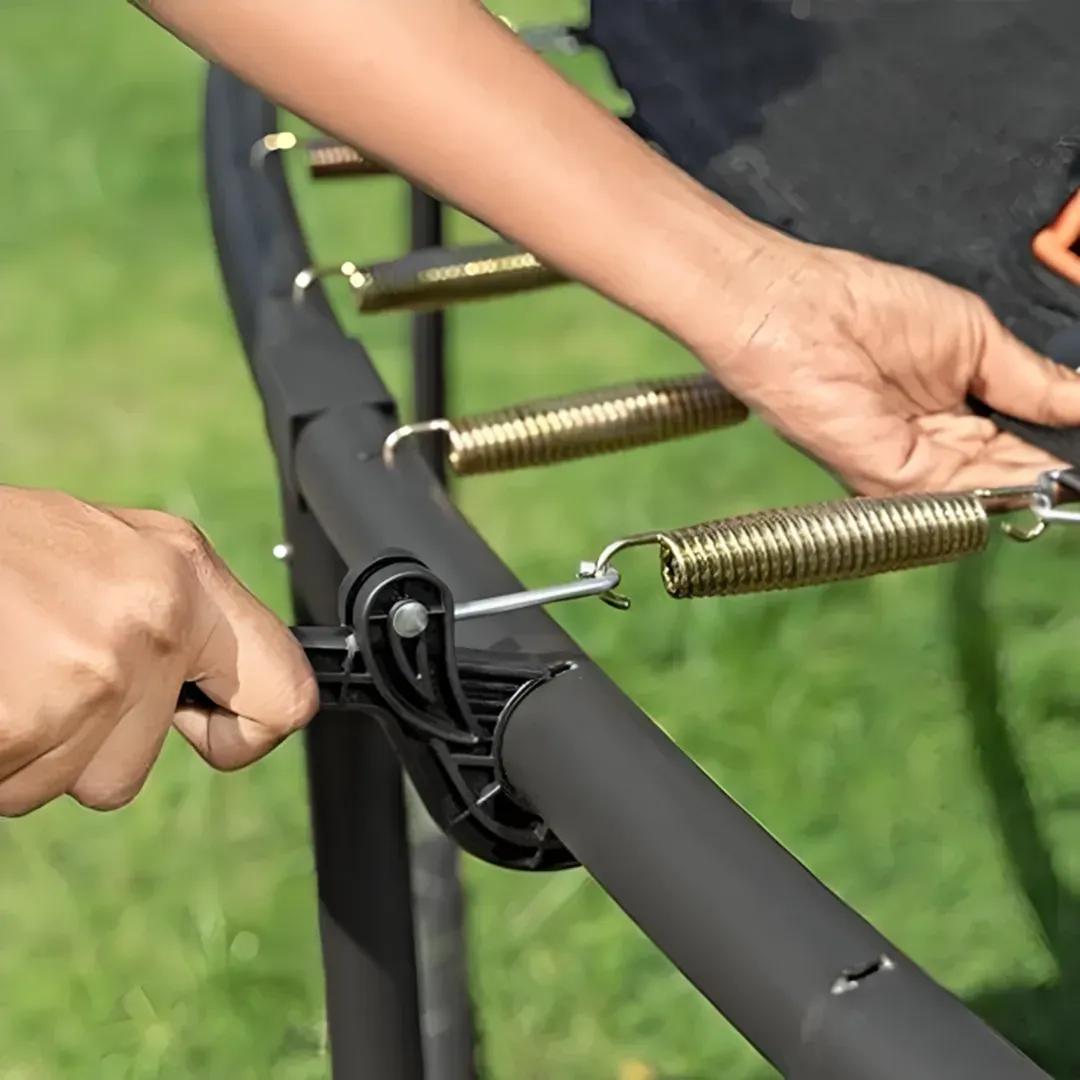 سهولة التركيب: يحتوي ترامبولين Xtreme Air على كل ما تحتاجه لترامبولين متكامل، بما في ذلك مجموعة تجميع سهلة تتضمن أداة ترامبولين QuickSpring الحاصلة على براءة اختراع من Bestway لتركيب زنبركي سهل مع مقبض مفتاح مزدوج الحركة، بالإضافة إلى وصلات دبوس زنبركي ومسامير على أعمدة الهيكل لسهولة التركيب.