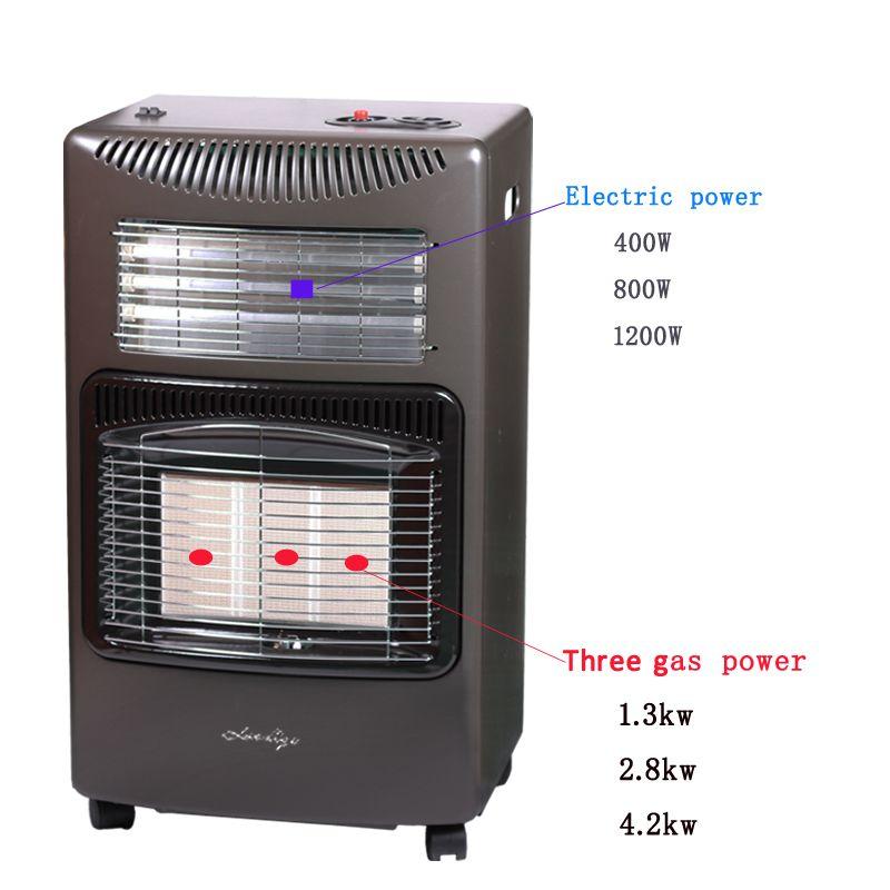 سخان مبتكر يعمل بالغاز والكهرباء، ويمكن تشغيله بالغاز والكهرباء معًا أو بشكل منفصل. يعمل بغاز البوتان أو بالكهرباء. لن ينقطع التدفئة بعد الآن في حال انقطاع التيار الكهربائي أو نفاد غاز البوتان. نظام تدفئة مزدوج. سخان غاز قوي يصل إلى 4100 واط وسخان كهربائي مصمم بتقنية الأشعة تحت الحمراء. حتى في الغرف المفتوحة الكبيرة، ستكون كفاءة التدفئة مثالية. إشعال كهربائي تلقائي بضغطة زر يجعل التشغيل سريعًا وسهلاً. يتيح لك إعداد الحرارة وصمام التحكم المدمج ضبط درجة الحرارة حسب رغبتك. يتميز بثلاثة مستويات طاقة لتتمكن من اختيار درجة الحرارة التي تناسب احتياجاتك في أي وقت. الحد الأدنى: 1.5 كيلو واط، متوسط: 2.8 كيلو واط، الحد الأقصى: 4.1 كيلو واط. خفيف الوزن وسهل النقل بفضل عجلاته. بفضل عجلاتها الأربع الدوارة سهلة الانزلاق ومقبض الحمل المدمج، يُمكن نقل هذه المدفأة بسهولة في أرجاء المنزل أو المكتب دون أي ضوضاء أو اهتزازات مزعجة. تتسع لأسطوانات غاز يزيد وزنها عن 15 كجم. ضغط الغاز: 28-30/37 ملي بار. استهلاك الغاز: من 109 جم/ساعة كحد أدنى إلى 298 جم/ساعة كحد أقصى. الطاقة: 1200 واط.