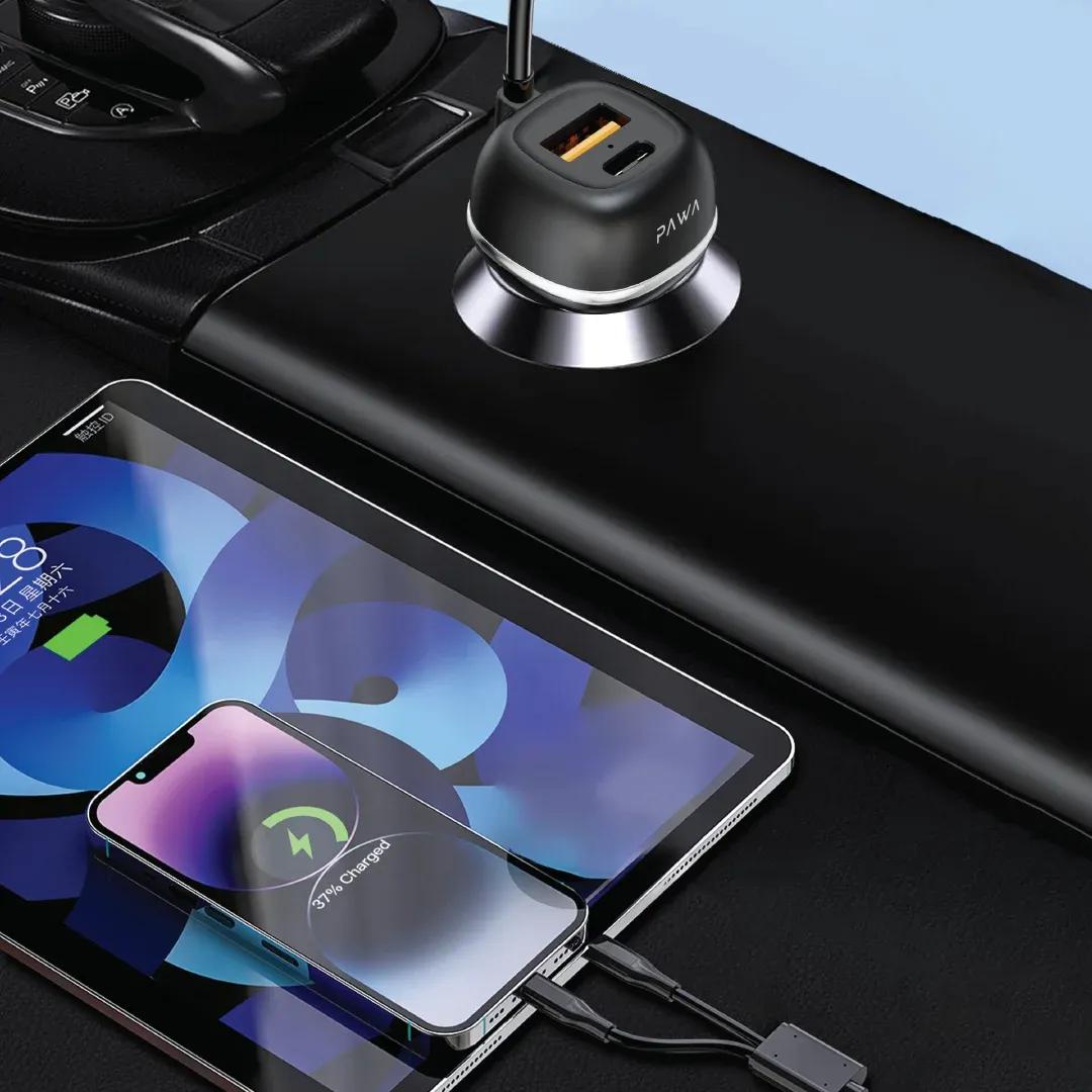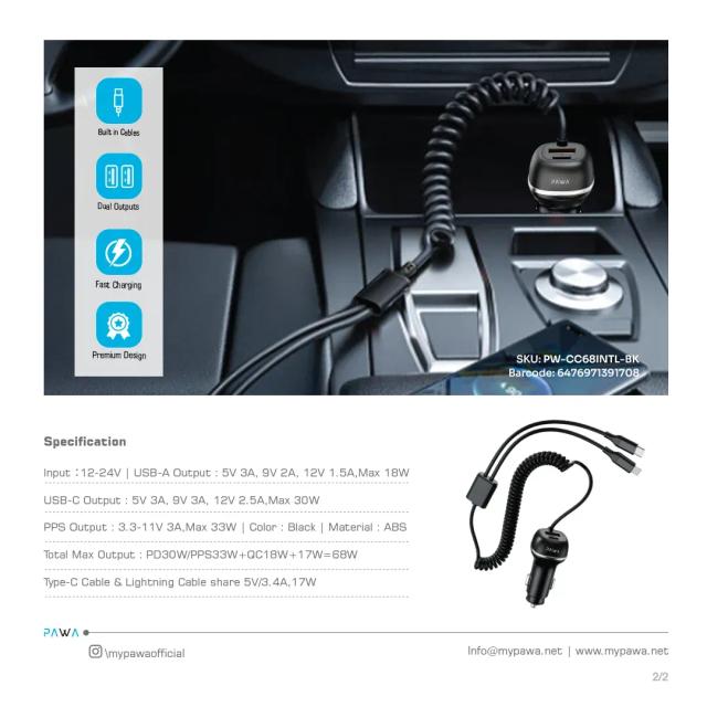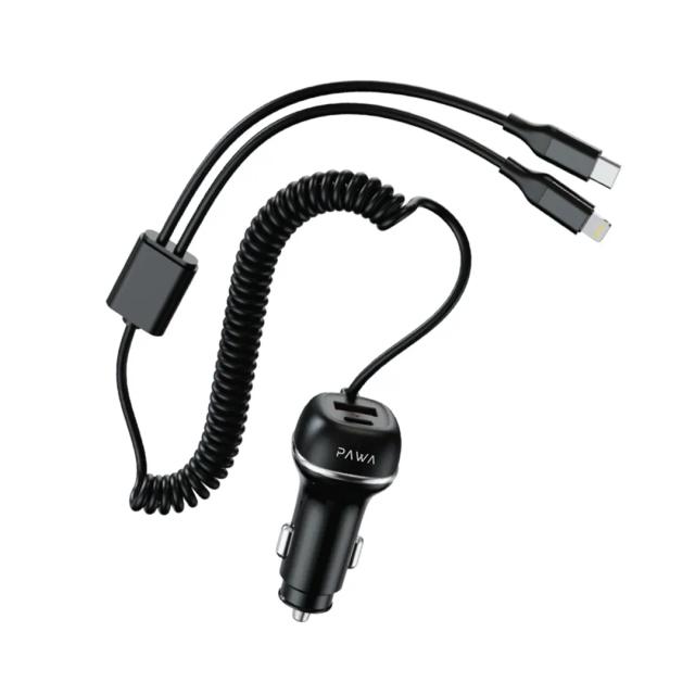 شاحن سيارة باوا ثنائي المنافذ بتقنية الشحن السريع PD+QC مع كابل مدمج USB-C و Lightning بقوة 68 واط