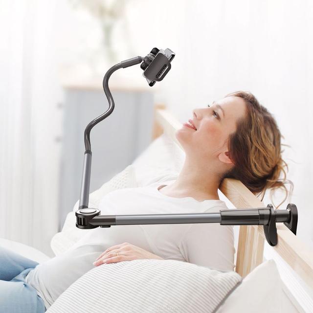 The stand features triple-stability enhancement technology, consisting of a double metal rod + flexible hose, ensuring your phone or tablet is held firmly without worrying about falling.