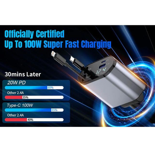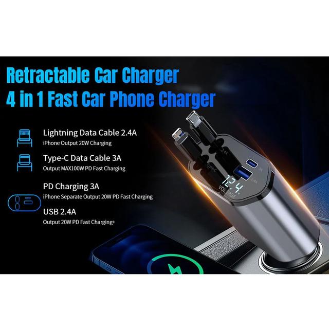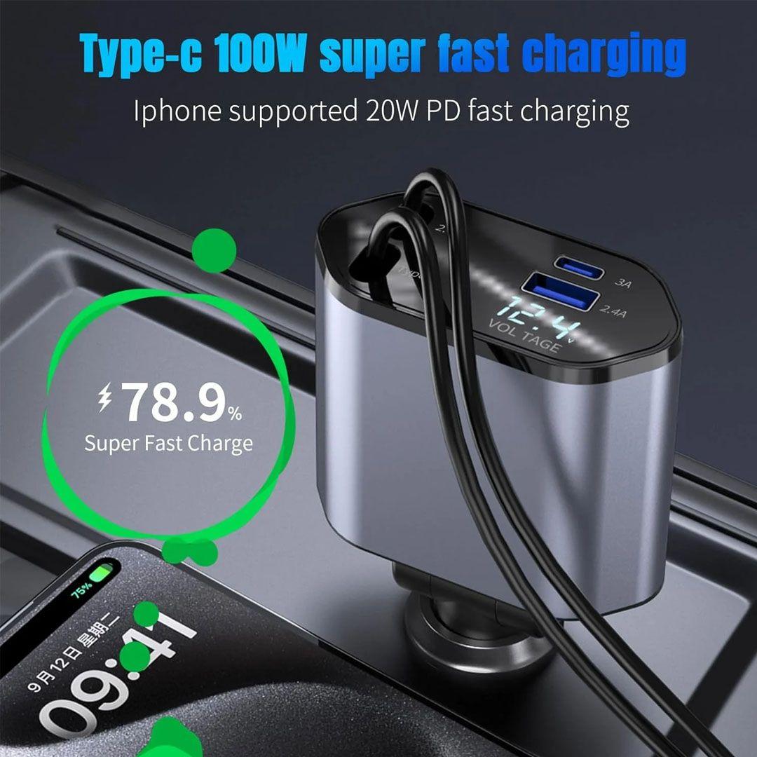 120W 4-in-1 Retractable Car Charger with 2 Charging Cables