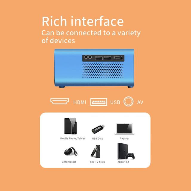 【Compatible Devices】This projector is very versatile and has HDMI, AV and USB port, allowing you to use it with cell phone, computer, tablet, USB flash drives, PS4 game console, etc.