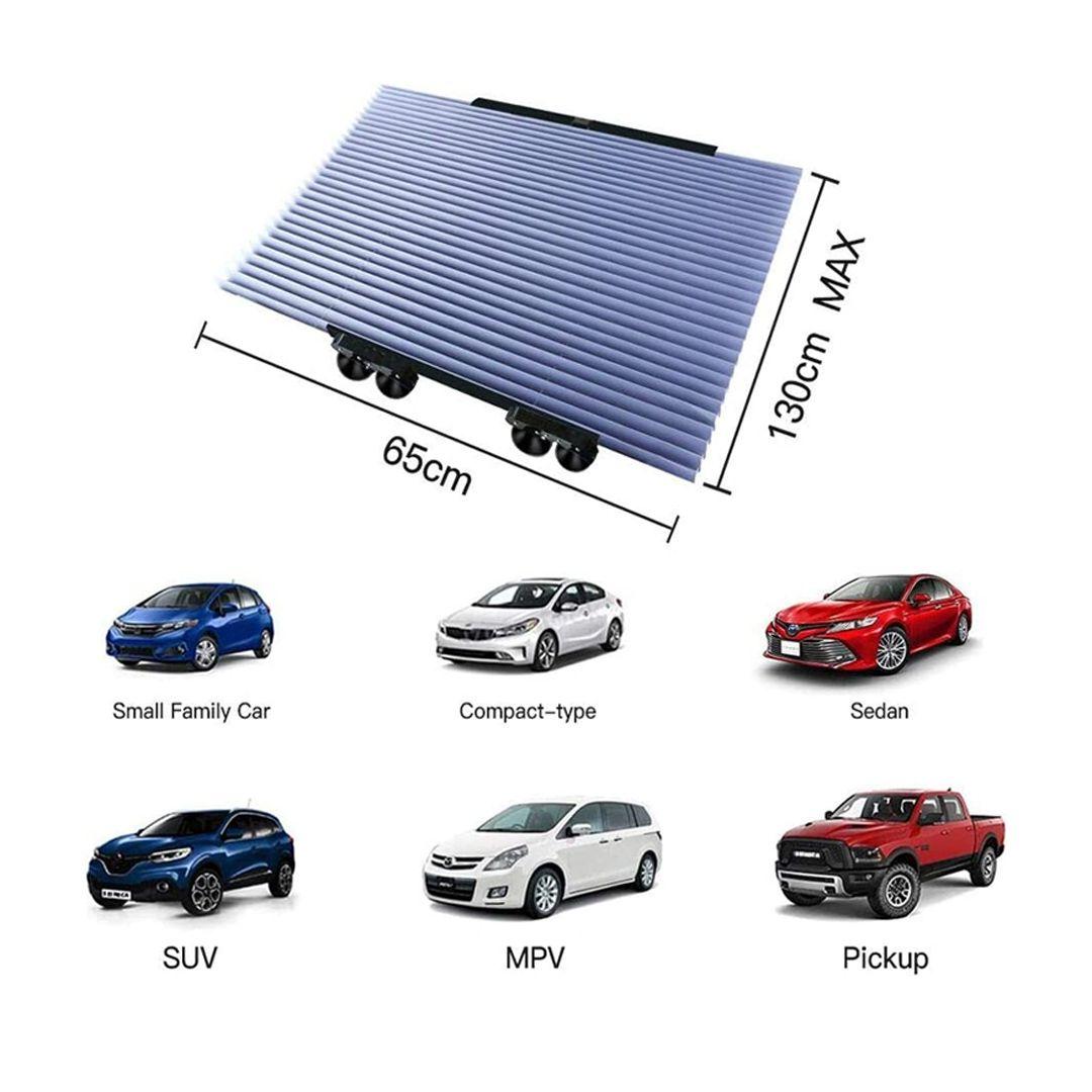Measures (Width: 65 cm - Length: 130 cm - Folded Length: 2.5 cm) fit most car models, including sedans, SUVs, and even compact cars.