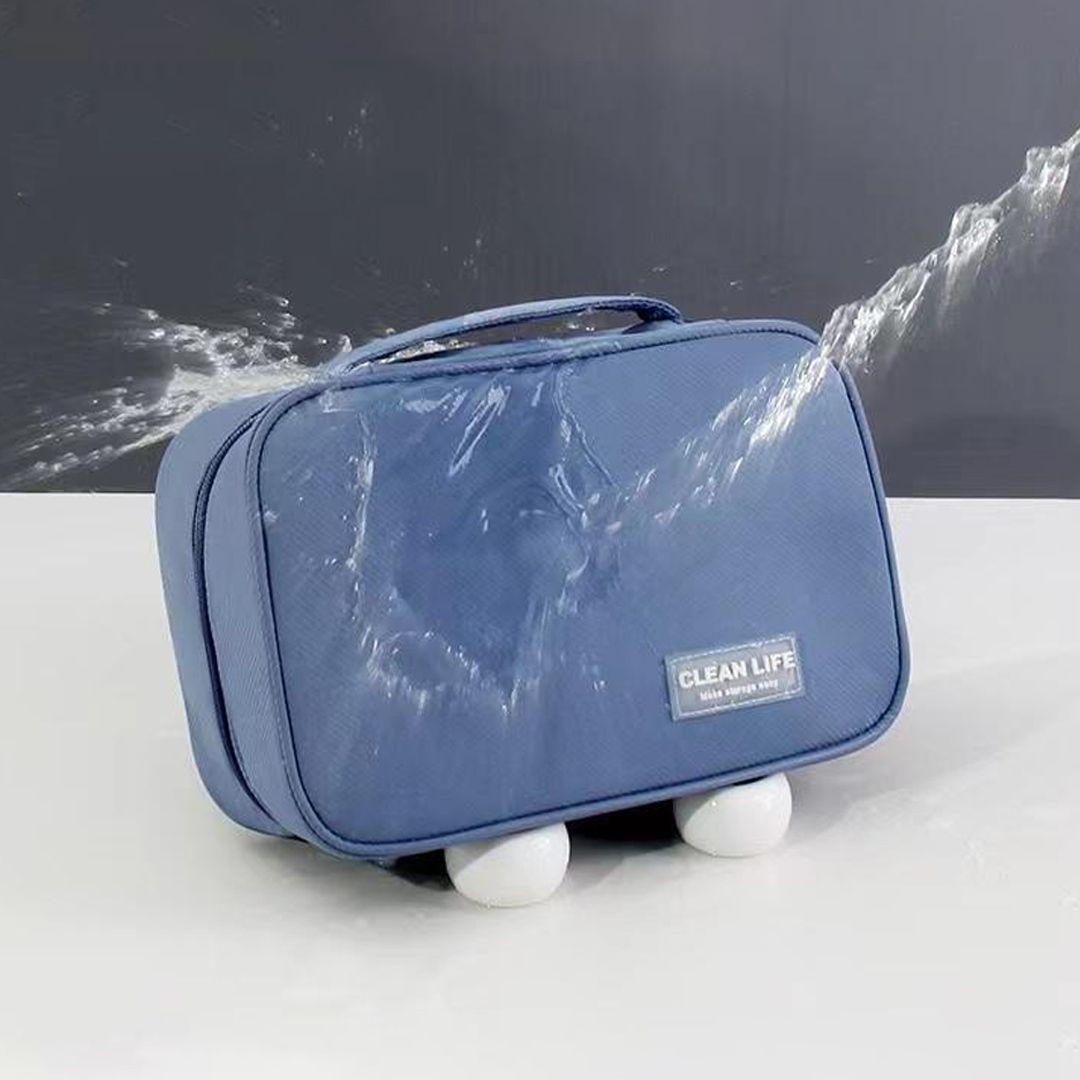 Features two main sections with small mesh pockets, a large waterproof pocket, and a transparent zippered pouch that can be detached for use in both dry and wet areas.