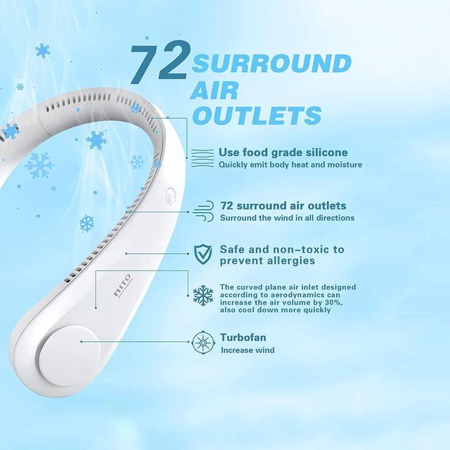 - Full-face cooling: 72 air outlets around the neck deliver a refreshing breeze to your entire face, making you feel like you’re under a mini air conditioner wherever you are.