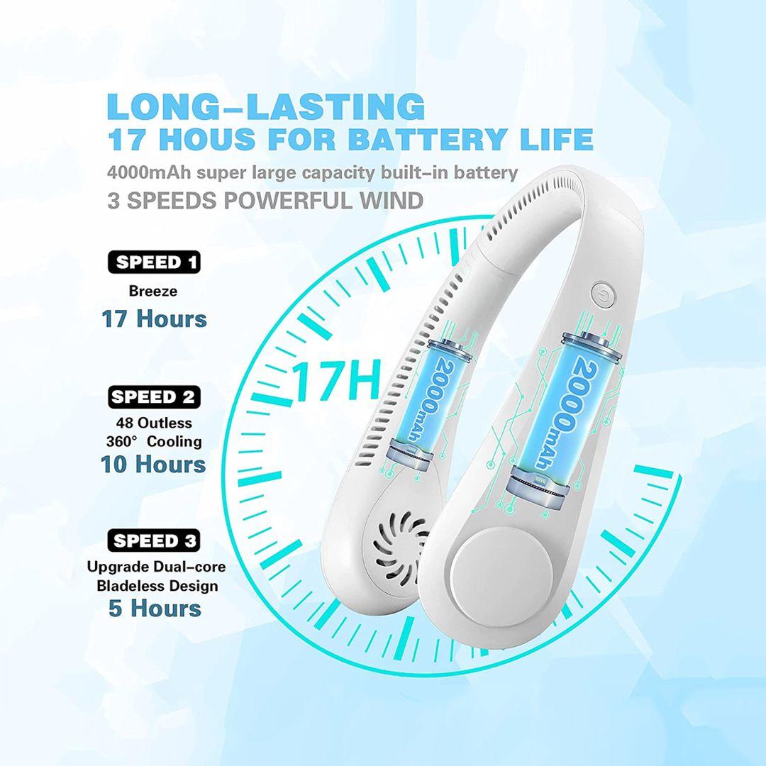 - Long-lasting coolness all day: 4000mAh battery provides 4 to 16 hours of operation depending on the speed you choose, keeping you refreshed all day long.