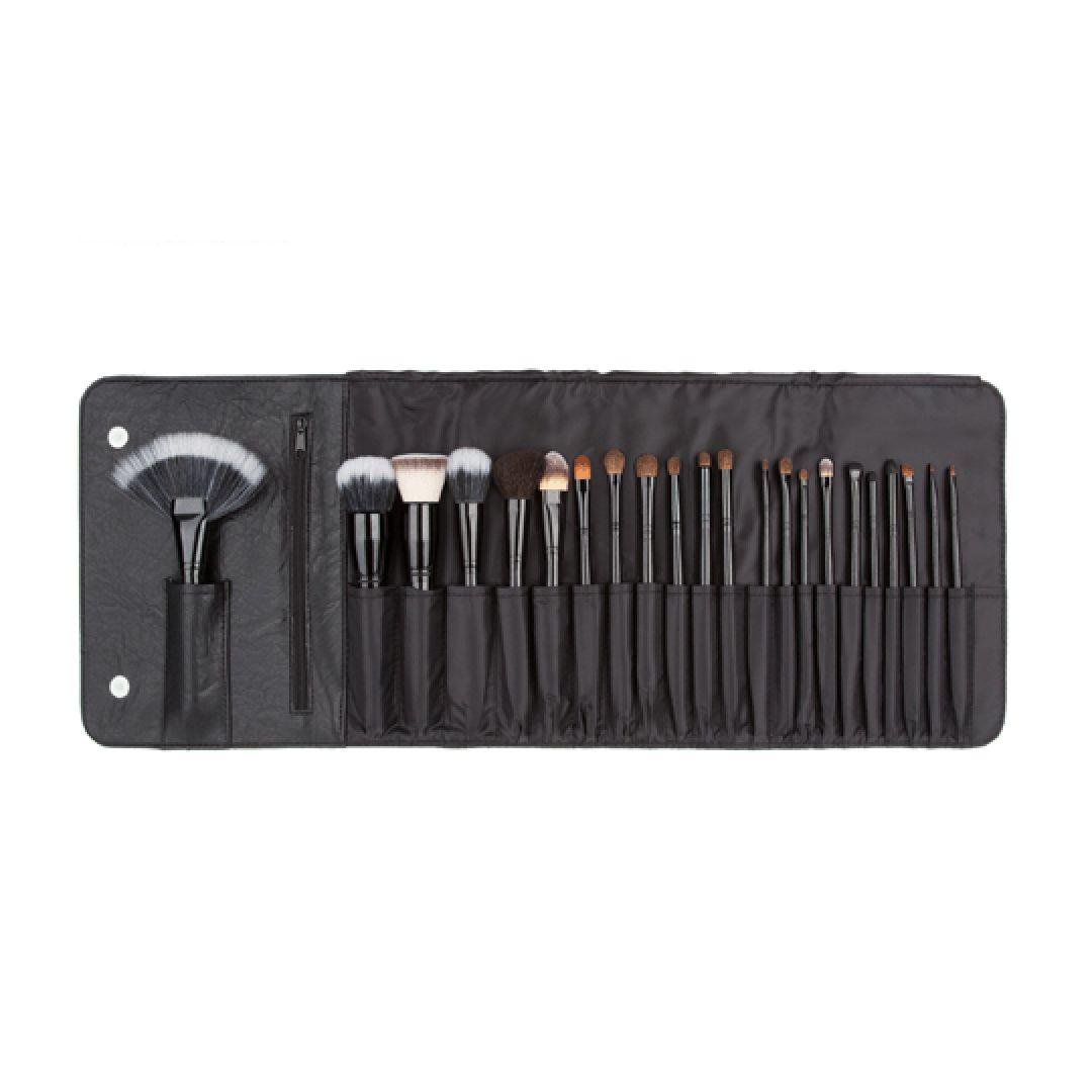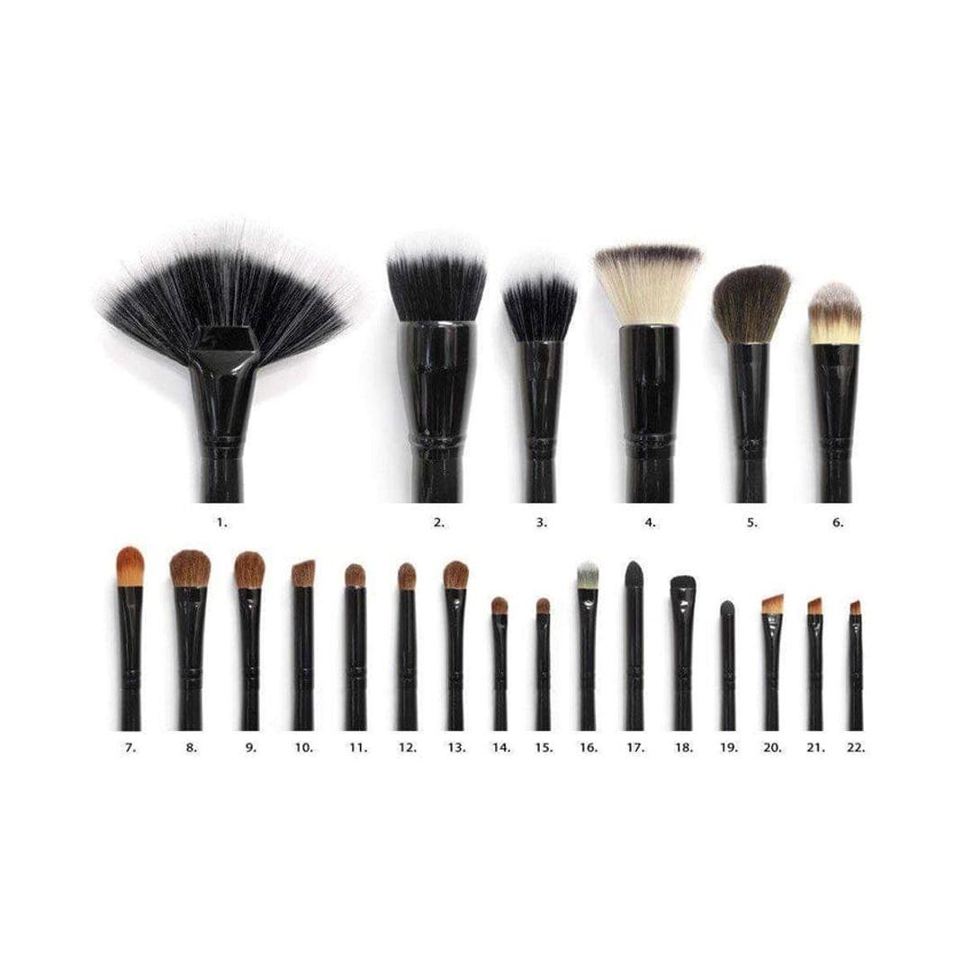 22 unique and assorted makeup brushes, and a leather case.
