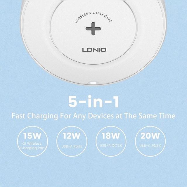 【Universal Compatibility】LDNIO desktop wireless charger is compatible with all Qi-enabled devices including AirPods wireless charging cases, iPhone 13/12/11/X/8/7/SE/mini/pro/pro max, Samsung Galaxy S22 Ultra/S22/S22+/S21.The Type C and USB ports enable fast charging of other devices, such as iPad/mini/air/pro, Galaxy A52, and more.