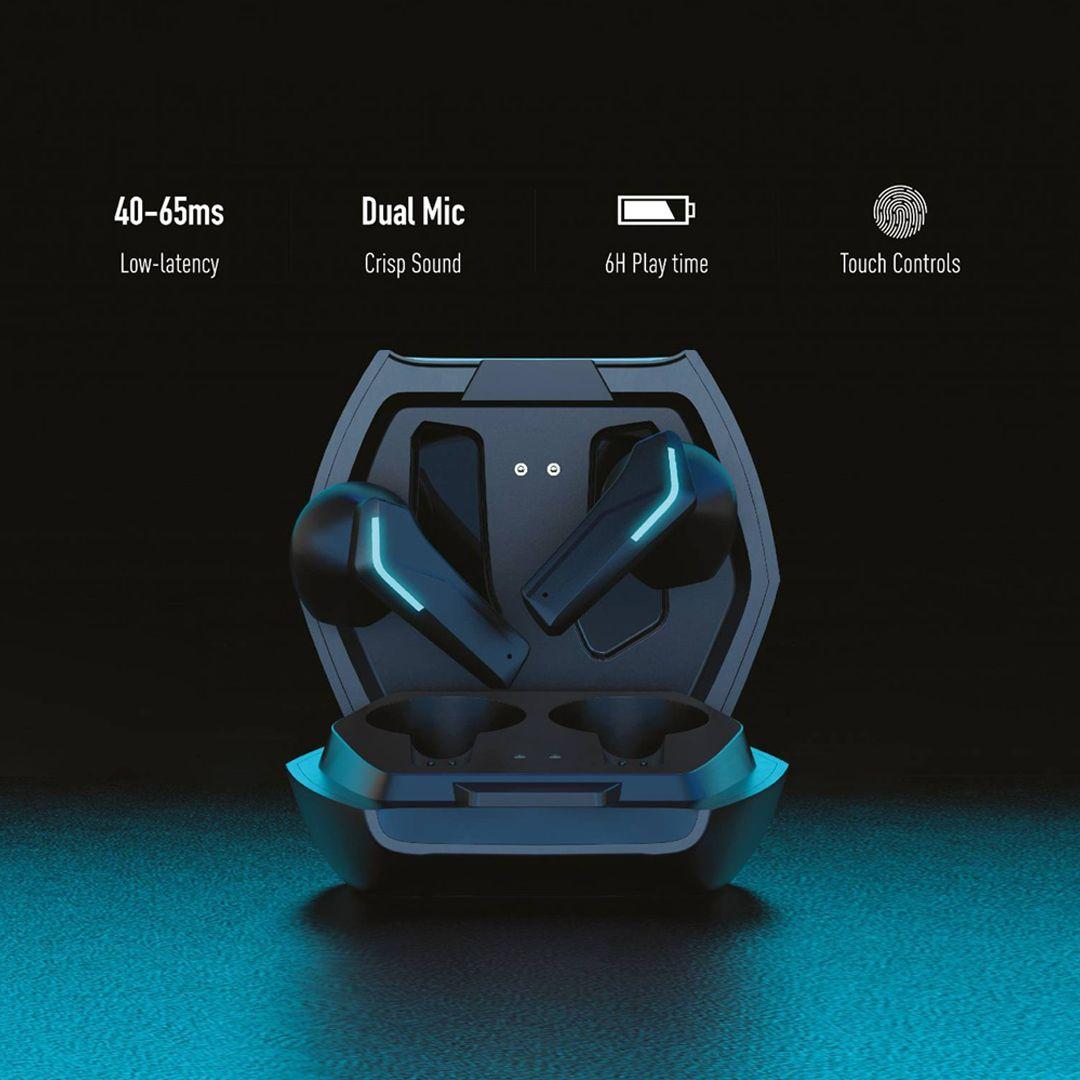 Porodo Gaming True-Wireless Earbuds comes with six hours of playtime. These earbuds are waterproof with dual mic crisp sound. It has touch control which means after you touch the right earbud the mode will switch between game mode and music mode. The charging case battery is 300mAh. The low latency rate for these earbuds is 40-65ms which proves that the audio inputs remain synced throughout your gaming sessions. You can listen to the music by high clear sound quality or change the mode to gaming and enjoy your game more than before, it’s up to you, choose any enjoy.