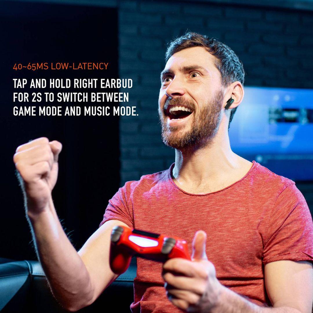 Tap and hold right earbud for 2s to switch between game mode and music mode.
