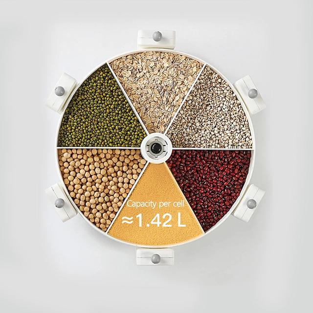6 Large Capacity Compartments: The dispenser has six separate compartments for storing different types of cereals or dry foods. It's transparent on the outside for easy storage, and the container can be rotated 360 degrees for easy access.