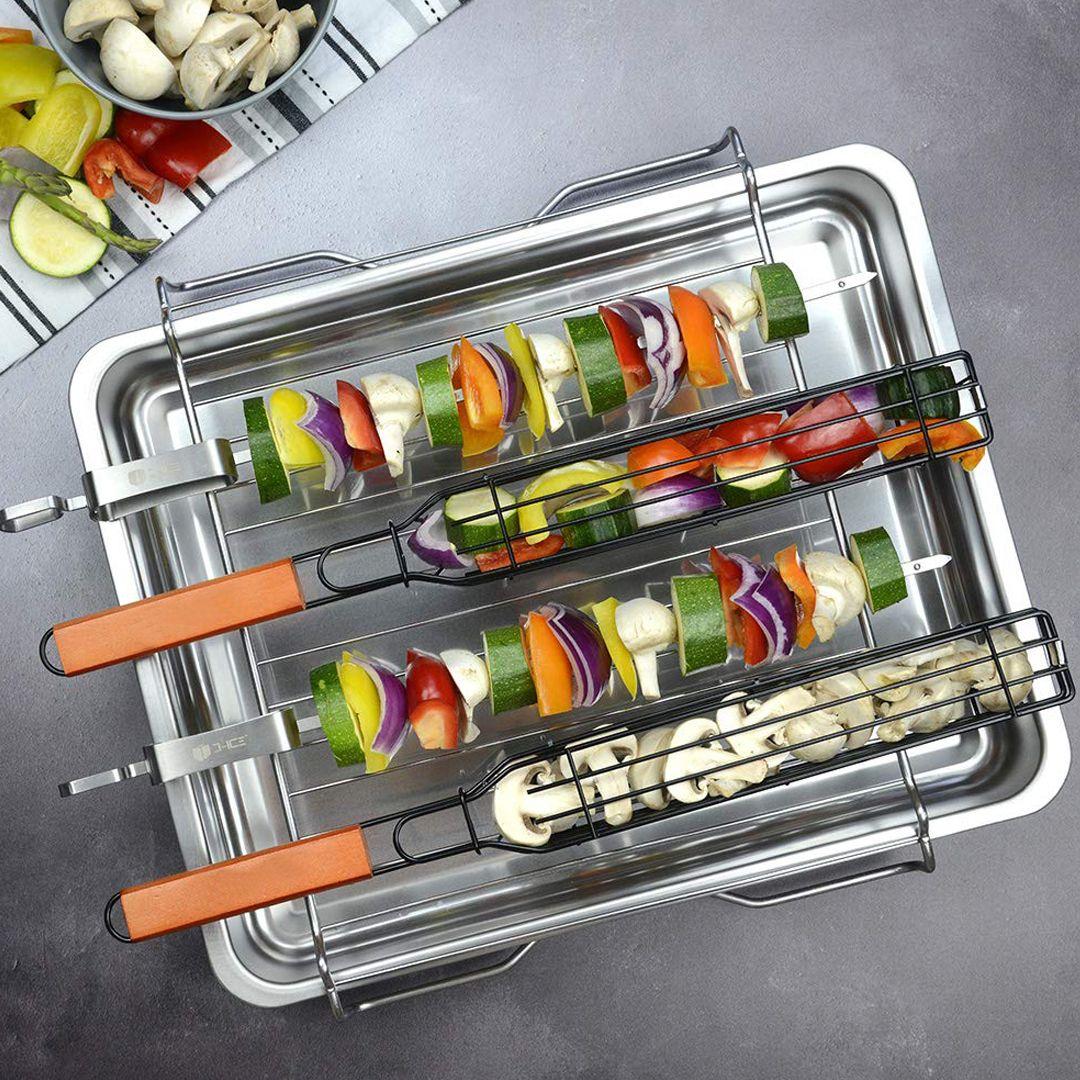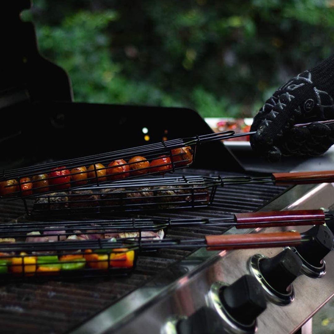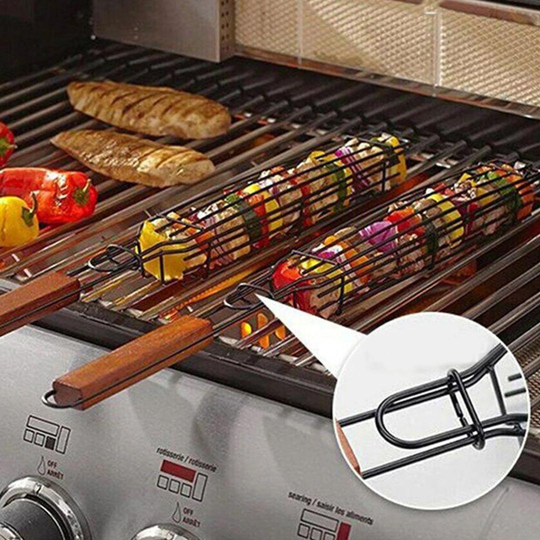 Portable Stainless Barbecue Grill Basket with Wooden Handle, Perfect BBQ Grilling Cookware
