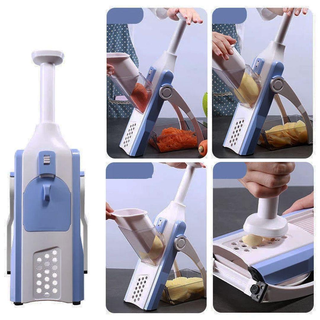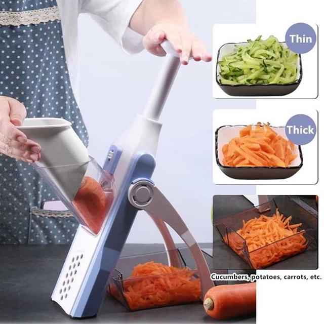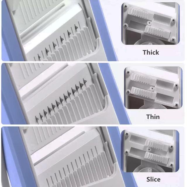 Convenience and versatility: it's an all-in-one vegetable slicer.no need to change the blades, only by turning the supervisors and pressing the handle, you can cut different fruits and vegetables into a unique shape and thickness (0.5mm to 8mm) such as slices, strips, Julienne and dice. No annoying cleaning work, you can rinse it out on the water, use the brush we provided to clean the blades.