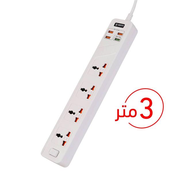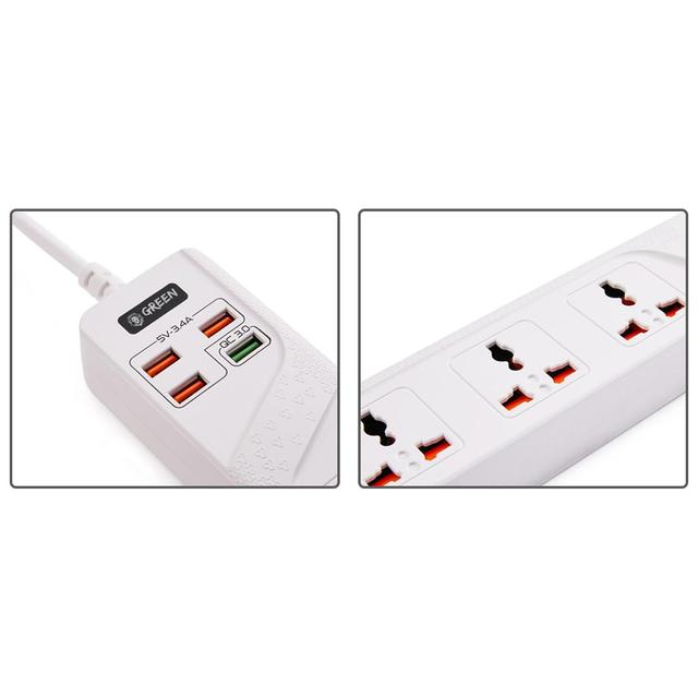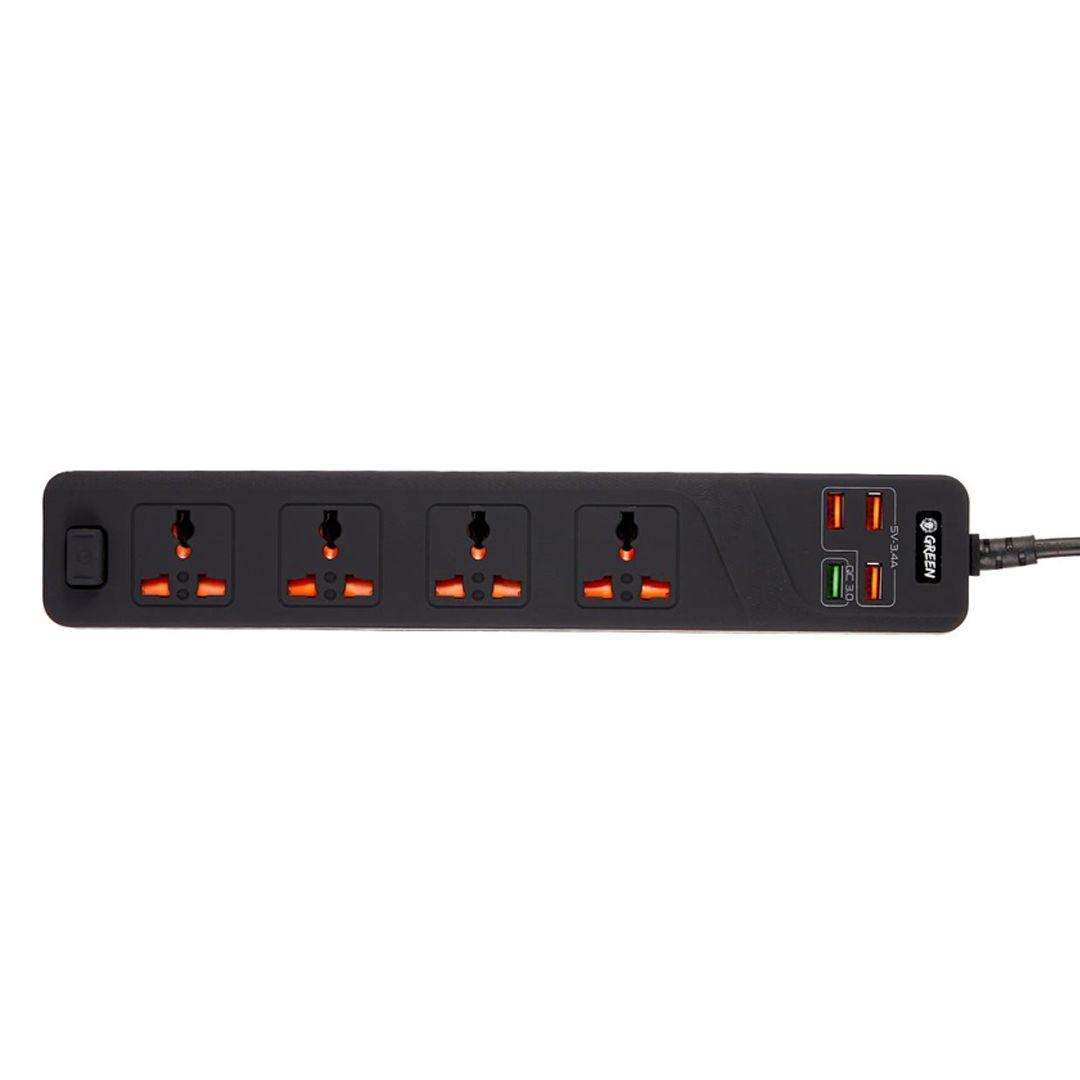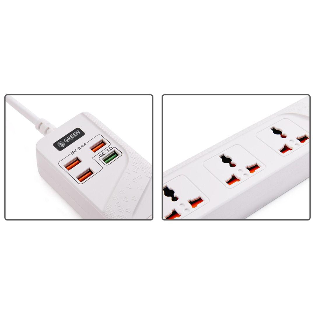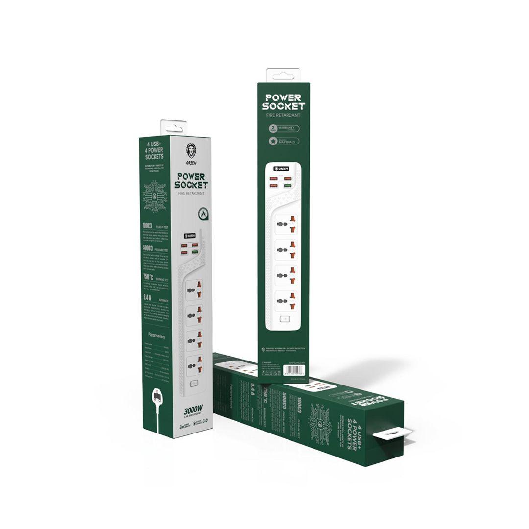 Green 4 AC 4 USB 3.4A QC3.0 Multiport Smart Power Socket 3000W 3M with Overload Protection
