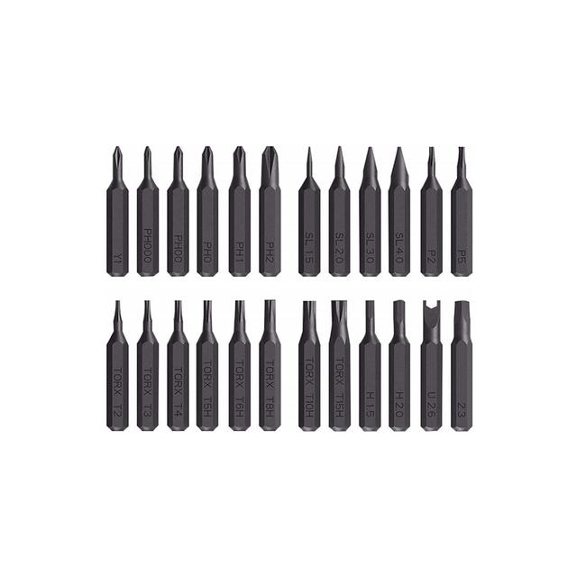 24 Pieces Precision Bits: Xiaomi screwdriver kit use a computer numerical control process for high accuracy (Tolerance: ±0.01mm), fit well to tiny screws of your electronics, including Philips, Flathead, Torx, Security Torx, Pentalobe, Triangle, Hexagons, Tri-point, Spanner meet ANSI Standard.