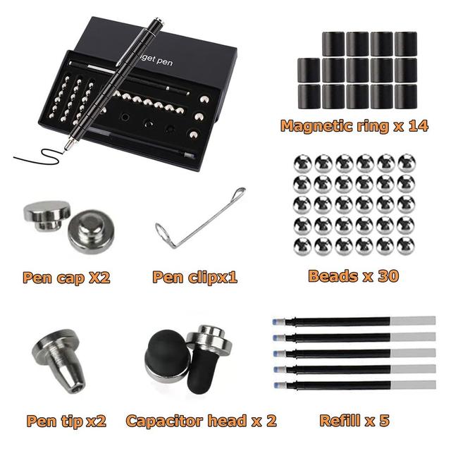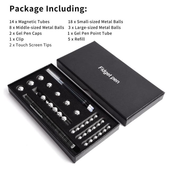 2 pen tips, can be used as gel pen, touch screen pen, 14pcs magnetic rings, 30pcs steel balls gift box.