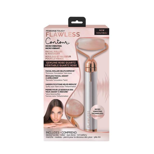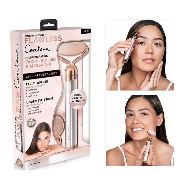Introducing Finishing Touch Flawless Contour, a vibrating facial roller and massager. This is not your every day Jade facial roller. Made of genuine Rose Quartz, Flawless Contour combines controlled vibrating technology with genuine Rose Quartz to amplify your facial roller and massager results. This non-invasive exfoliation tool has two attachments: The facial roller is designed to help improve firmness and skin tone and help reduce the appearance of fine lines and wrinkles. Flawless contour facial roller also includes an under eye press which helps reduce puffy eyes and dark circles. For a flawless feel and a flawless finish - you can count on Finishing Touch Flawless Contour.
