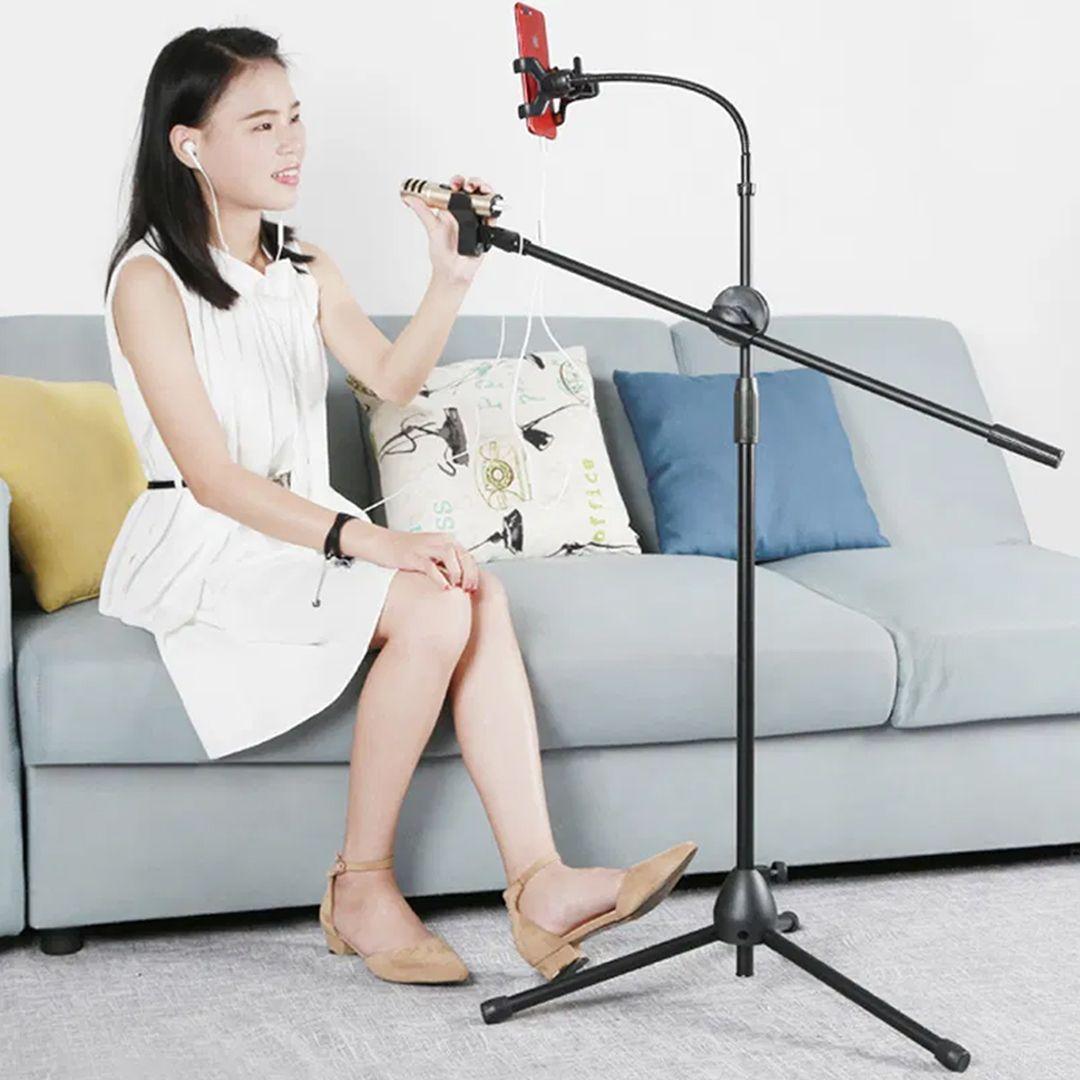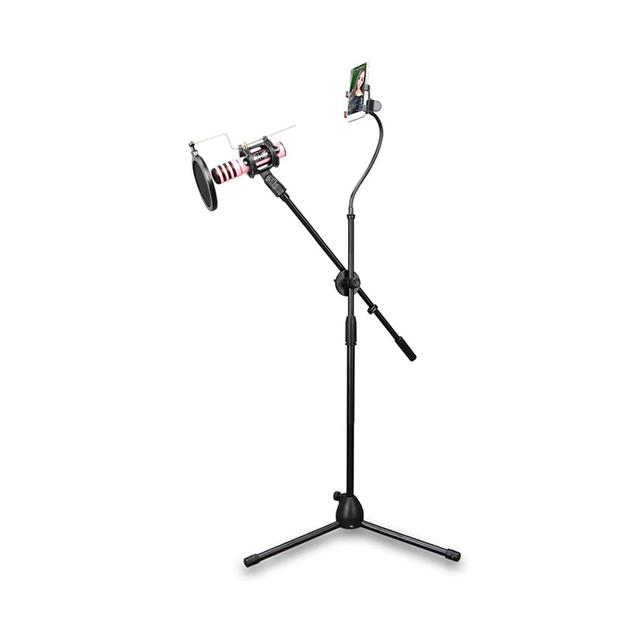 Get the best audio and video recording experience with the 3-in-1 Microphone and Phone Stand. It features a robust design that supports 360-degree angle adjustment, giving you complete flexibility while recording. Ideal for live streaming, podcasting, online meetings, singing, and studio recording. It features a dual filter to reduce noise and improve sound quality, and a tripod stand provides high stability.