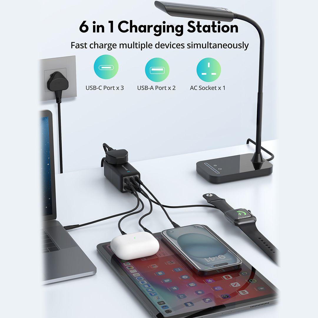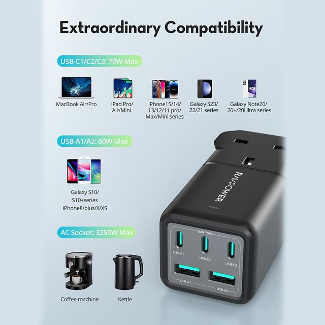 Charge all your devices quickly and safely with the RAVPower Multi-Port Travel Charger. With its amazing 75W power, you can charge 5 devices at the same time, such as your phone, laptop, and more. With advanced over-current protection to ensure safe and efficient charging.