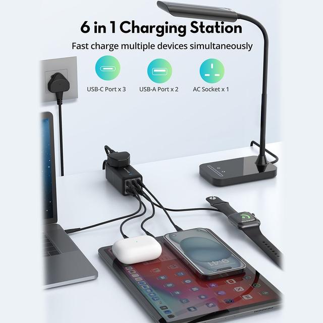 - Number of ports: 3 Type-C ports and 2 USB ports with power outlet and UK plug