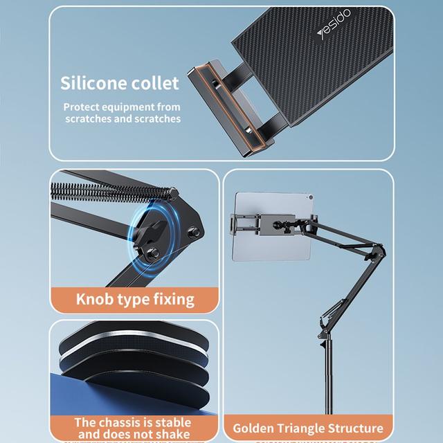 Enjoy ultimate convenience with the Yesido C295 phone and tablet stand, designed to provide a smooth and practical user experience. Crafted from durable aluminum and steel, it features a sturdy floor base for maximum stability. With its three-stage folding mechanism and adjustable height up to 150cm, you can easily set it up for work, study, or entertainment.