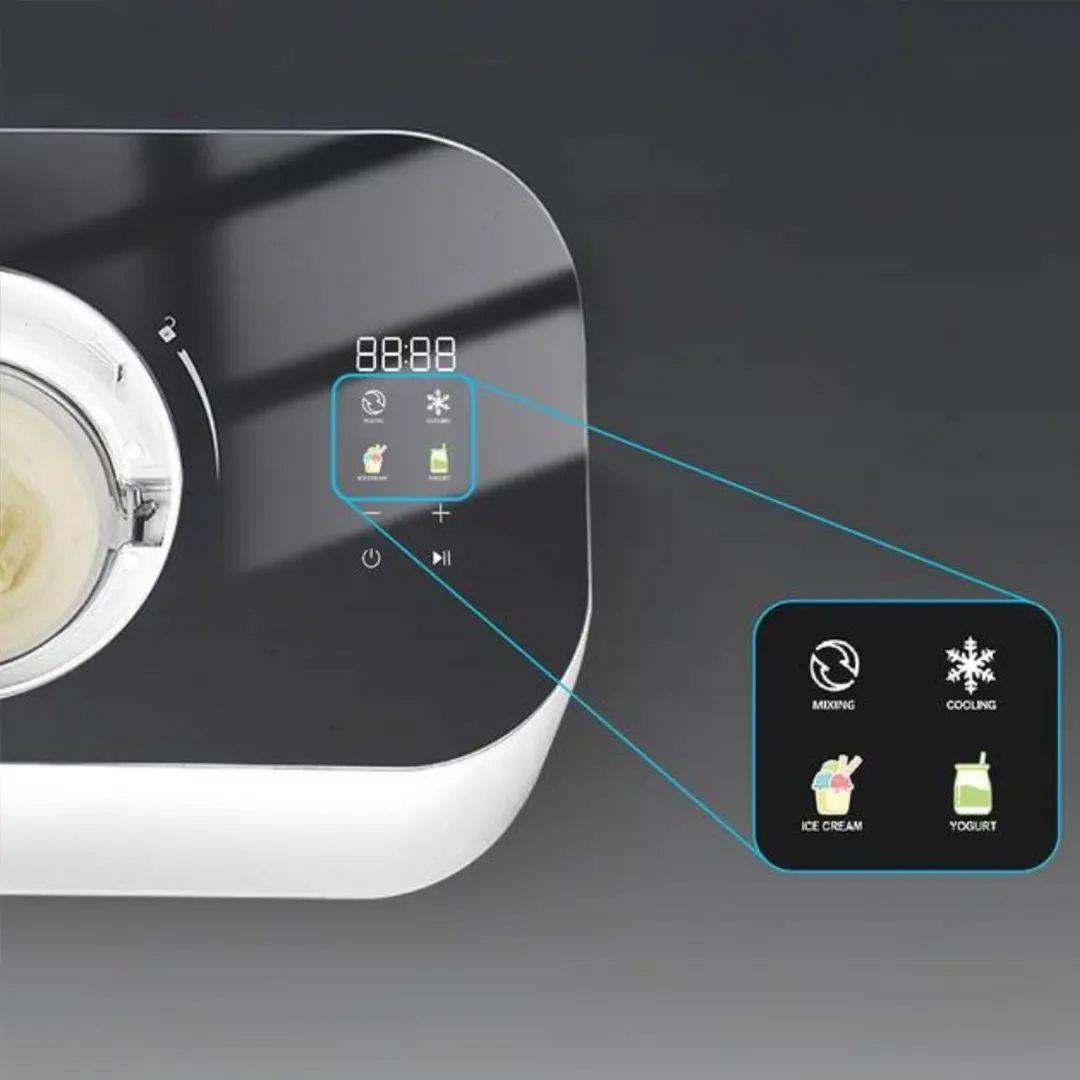 Full Control: It has four modes: blending, cooling, ice cream, and yogurt. The +/- buttons allow precise timing, and there's also a power button and timer.