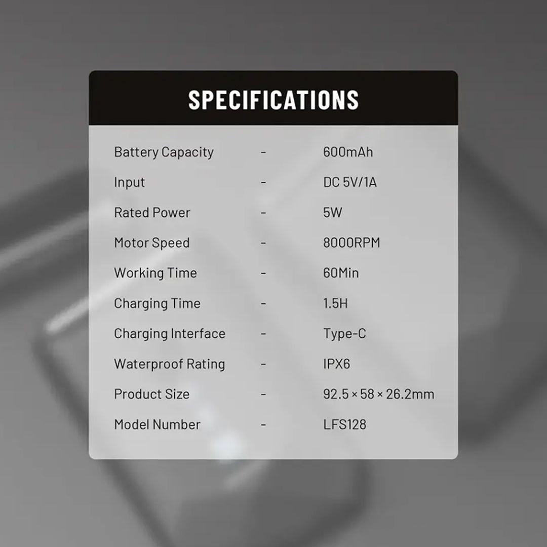 It charges via Type-C, and its 600mAh battery provides 60 minutes of runtime after just an hour and a half of charging—so it's always ready to go.