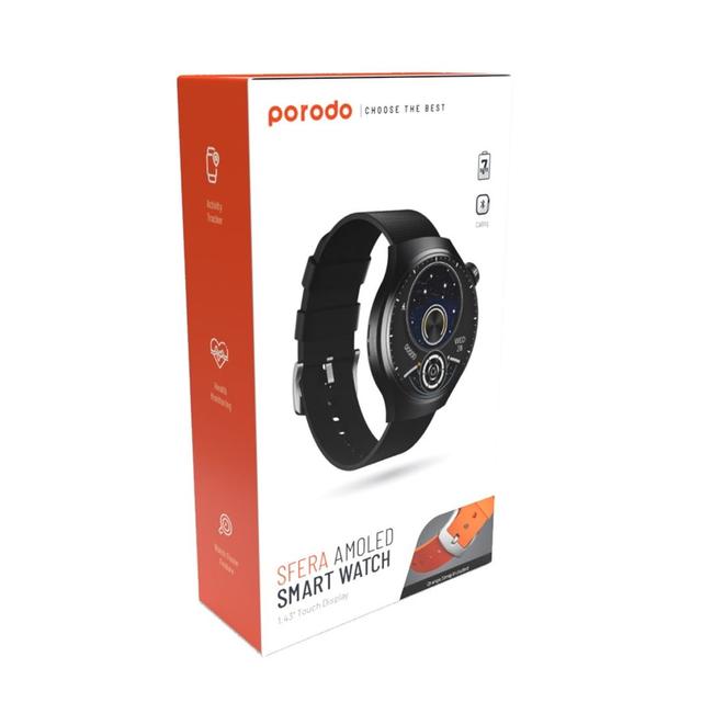 The Porodo Sfera Smart Watch brings you a complete experience – sleek design, vivid touch display, health and fitness tracking, plus an extra orange strap to add a bold touch of style.