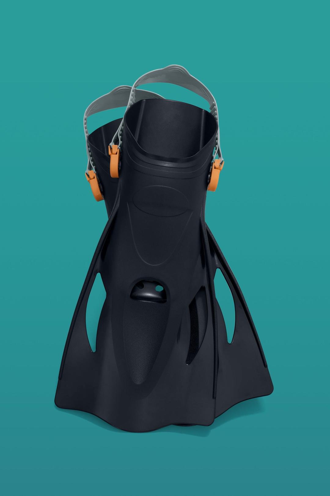 A pair of fins in sizes US (8-12) / EUR (41-46) with an adjustable heel strap – providing excellent propulsion in the water with stability and comfort.
